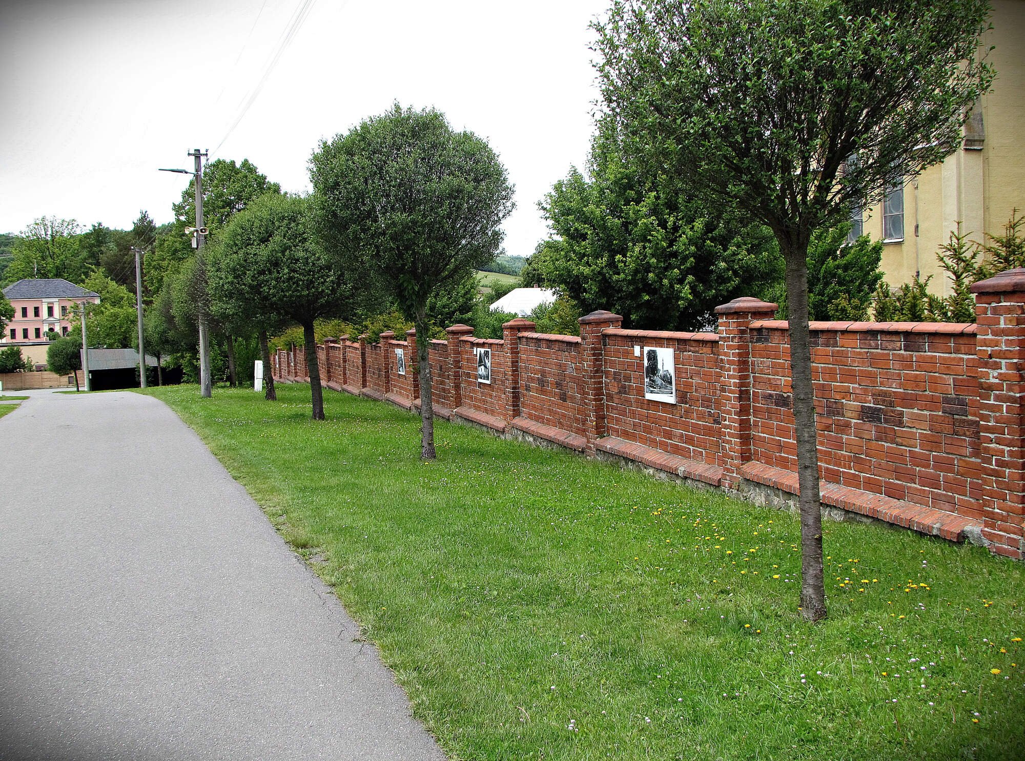 Hřbitov s kostelem Božského Srdce Páně je obklopen cihlovou ohradní zdí. Při její jižní straně prochází ulice, která celkem nedávno dostala název Galerijní. To podle kuriózního projektu zkrášlit na této straně cihlovou zeď žalova velkými černobílými fotografiemi z dob dávno minulých. Na snímcích si můžeme prohlédnout např.prastarou podobu Společenského domu, rodného stavení Františka Palackého, Zájezdního hostince Palackých anebo dřevěného kostela sv.Ondřeje. Na takovéto venkovní galerii by samozřejmě nic unikátního nebylo (vždyť takové mají i leckde jinde), ale tady v Hodslavicích je obohacena o jedno „kouzlo.“
