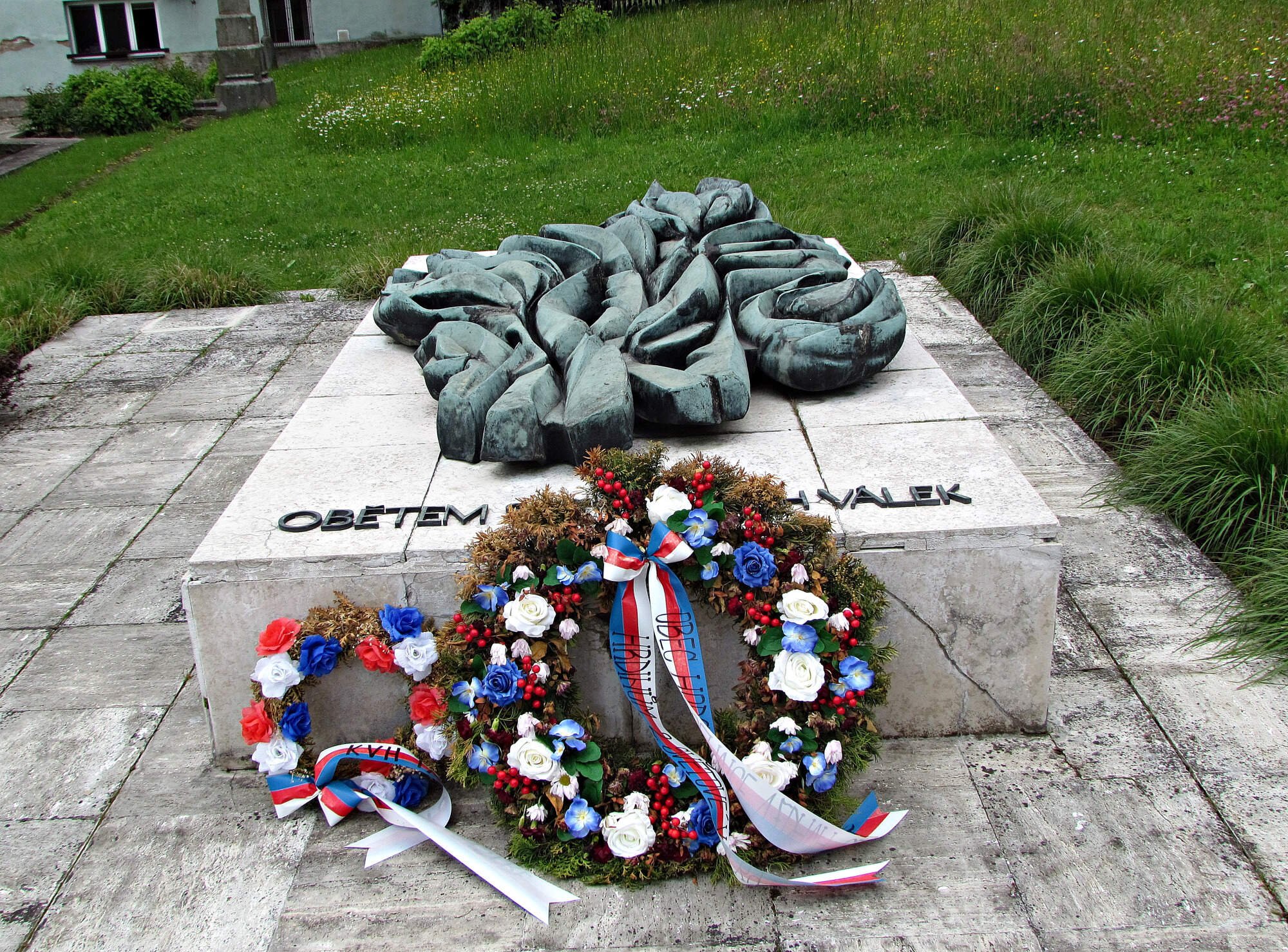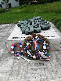 Nachází se na travnaté parčíkově upravené ploše před budovou Obecního úřadu a dřevěným kostelem sv.Ondřeje. Poněkud skromný pomník opatřený nápisem „OBĚTEM SVĚTOVÝCH VÁLEK“ má podobu obdélného nízkého hranolu, obloženého mramorovými deskami a na něm umístěné bronzové plastiky. Při prvním pohledu na ni mi nebylo až tak jasné, co má vlastně znázorňovat, ale při pátrání na netu jsem narazil na fotografii pořízenou z výšky a jedná se o stylizovaný svazek květů.