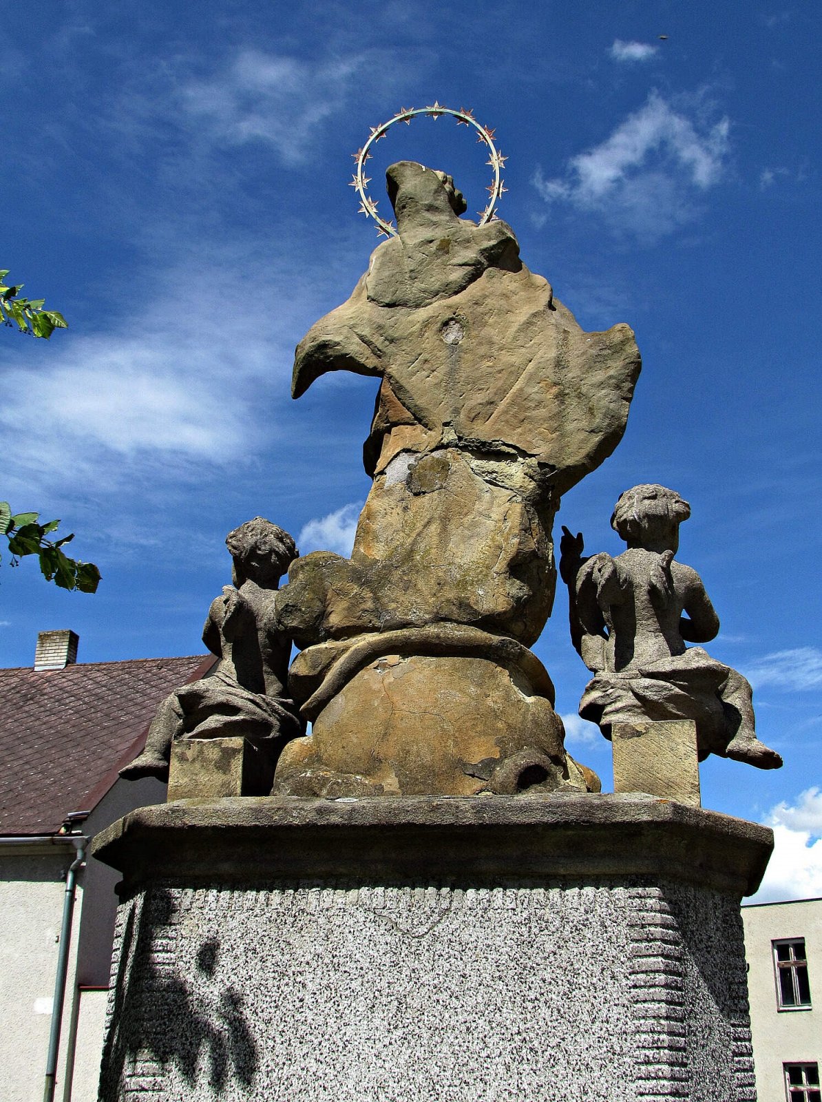 Socha Panny Marie Immaculaty byla zrobena v hodně podživotní velikosti (asi na ni neměli místní dost peněz) a je po stranách doplněna plastikami andílků. Dnes je umístěna na masivním hranolovém podstavci novějšího data, který bohužel Bohorodičku opticky ještě zmenšuje. Navíc tahle kombinace dvou různých kamenných materiálů nepůsobí na naše zraky zrovna moc příznivým dojmem.