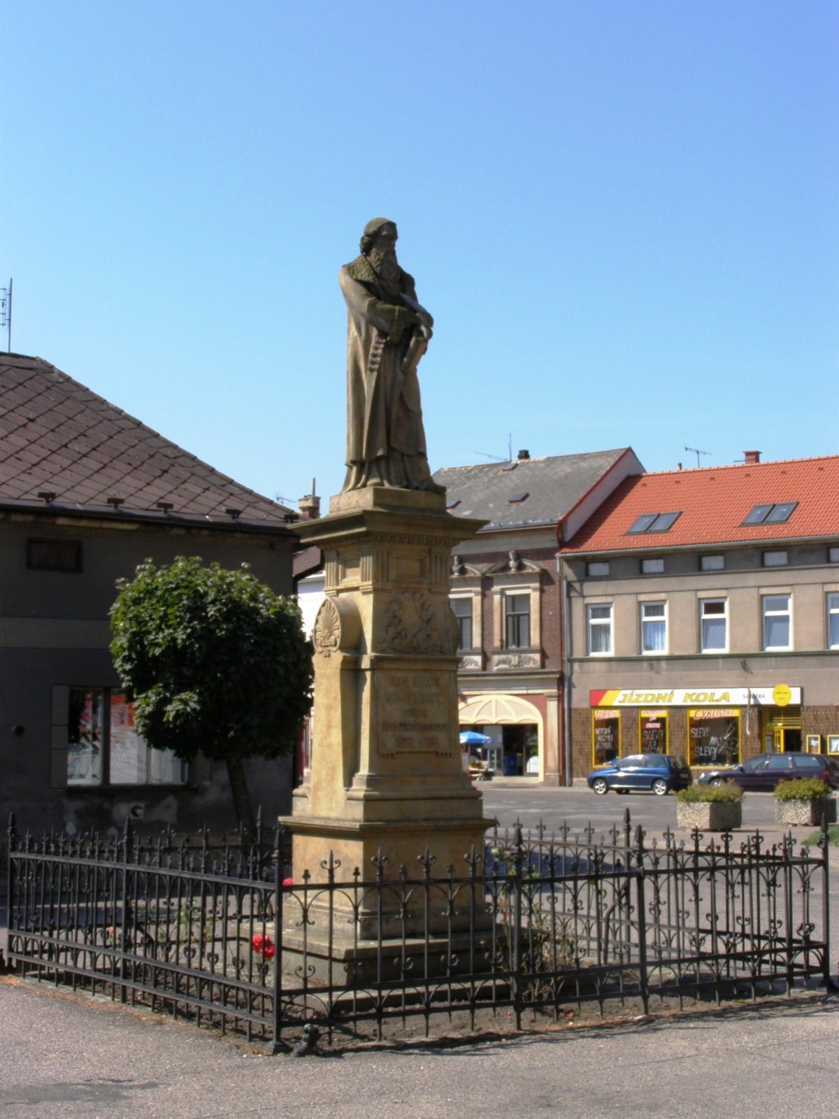 Okolí děkanského kostela Narození Panny Marie je sochařsky bohaté, neboť u něj nalezneme sochy sv. Floriána, Panny Marie s Jezulátkem, Krista v Getsemanské zahradě, kamenný kříž a sochu sv. Jana Nepomuckého, jíž se chci právě krátce věnovat.První věcí, která člověka při pohledu na ni zaujme, je to, že je zde tento světec vyobrazen jinak, než bývá časté, čehož si všiml také P. F…