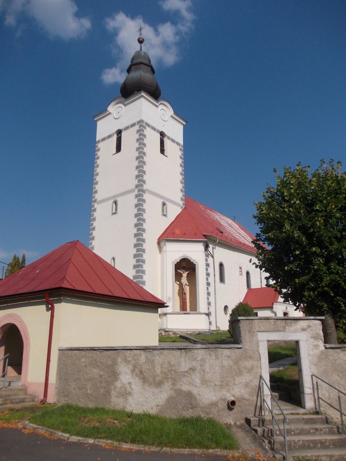Vľavo u kostola je lurdská jaskyňa Panny Márie a drevený kríž ľudovej misie z rokov 1997 a 2008.