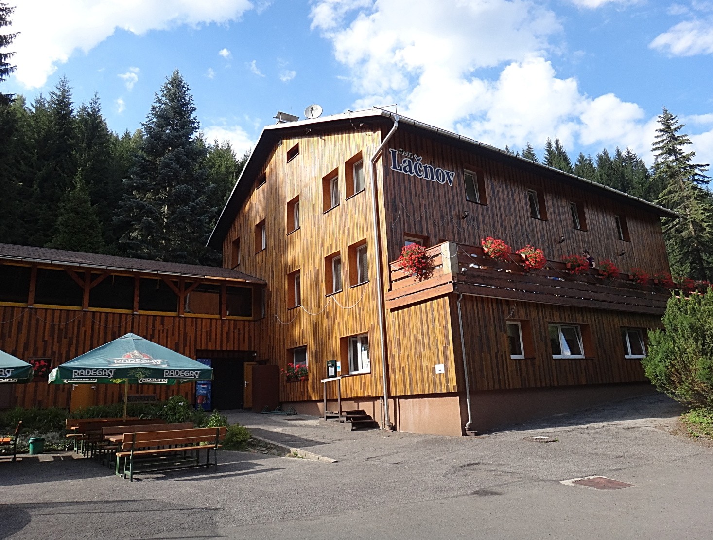 Při svých toulkách po Těšínských Beskydech se opět ocitáme v Horní Lomné. Tentokrát jdeme na odpolední procházku od penzionu U Studánky na opačnou stranu. Po krátké chůzi po cestě odbočujeme doleva a doslova po pár metrech jsme u podnikového střediska bývalých Třineckých železáren Lačnov. Nyní je to hotel Lačnov D5 a.s. Třinec. U hotelu jsou kurty, bazén, dětský areál. Na fotografiích i webových stránkách můžete vidět, jaké služby hotel poskytuje. Zastavujeme se na malou chvíli, aby se děti sklouzly a pohoupaly, i když je areál určen jen pro ubytované. Já se jdu podívat jak vypadá vevnitř alespoň restaurace. V areálu ale moc velký pohyb nebyl, připado mi to tam prázdné. A už pokračujeme dále do přírody.