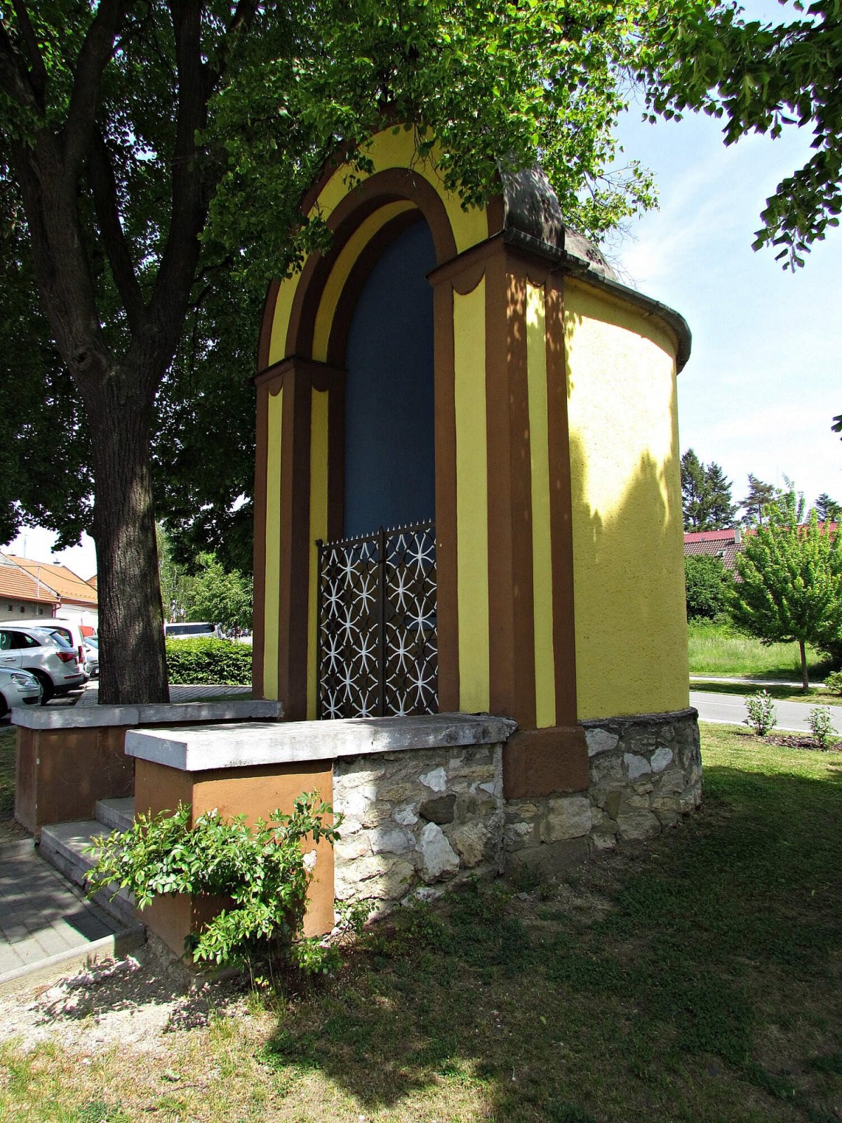 Ta první, ukrytá ve stínu stromů (a se žlutohnědou fasádou), je skutečnou sakrální stavbičkou. Jedná se o prostou výklenkovou kapli a její otevřený interiérek s modrým pozadím krášlí pěkná plastika Piety, kterou věnovaly členky spolku sv.Terezie.