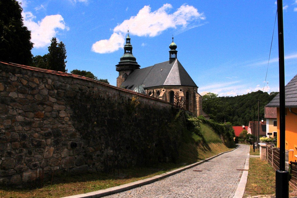 Horní Slavkov je město se zajímavou minulostí. První písemná zmínka je již z roku 1322 a to už bylo město jedním z významných míst v této oblasti. Dochovalo se ve středověké podobě až do roku 1952, kdy bylo vyhlášeno městskou památkovou rezervací. Následoval neuvěřitelný obrat. Ve městě bylo během několika let zbouráno 249 historických objektů. Přesto se zachovalo několik památkově chráněných objektů, mezi které patří i místní kostel. Od roku 1992 je stará část městskou památkovou zónou. Místní kostel byl postaven v místě, kde stával menší románský kostelík, o němž je zmínka z roku 1242. Nový kostel v pozdně gotickém slohu je zmiňován v roce 1380. Významná byla přestavba mezi roky 1515 – 1523, o kterou se zasloužil Jan Pluh z Rabštejna. Byla postavena velká nová loď a dvě věže a kostel se stal městskou pevností. Po roce 1659 přibylo osmiboké patro a v 18. století došlo i na baroko. V roce 1784 byla odstraněna věž na severní straně a to do výšky lodi. Poslední přestavba proběhla v roce 1903. Po roce 1945 došlo na rozkrádání vnitřního zařízení s následnou devastací svatyně. Dne 14. 3. 1964 vyhořela střecha presbytáře a sanktusová vížka. Místní hasiči nemohli nastartovat auto a tak požár likvidovali hasiči ze Sokolova. V roce 1976 byly zničeny varhany a o rok později se začala opravovat střecha. Od roku 2009 je kostel v majetku města a postupně se opravuje. Dnes se díváme na jednolodní stavbu, na kterou navazuje polygonálně uzavřený presbytář s vysokými okny a podpěrnými pilíři. Při JZ straně je půlkruhová kaple. Sakristie je pod snesenou věží. V novější přístavbě na severní straně je vchod do kostela. Výrazná osmiboká věž je zakončena barokní bání s lucernou. Ke kostelu patří nedaleká barokní budova děkanství s mansardovou střechou, která je ve velmi špatném stavu. Kostel stojí na okraji hřbitova, na kterém se nachází kamenná zvonice. Další zajímavou památkou je barokní kaple Božího těla z roku 1736 východně od hřbitova. Do kostela lze pouze nahlédnout, probíhají v něm opravy. V turistické sezóně je veřejnosti přístupná kostelní věž. Kostel i ostatní objekty jsou památkově chráněny.