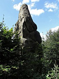 O této pozoruhodné skalní formaci (označované někdy jako „Skály pod Tisovým“) už jsem tu v minulosti psal. A při poslední návštěvě před 12 lety se dokonce rozplýval nadšením nad tím, že majitel pozemku provedl novou lesní výsadbu na všech stranách až ve vzdálenosti deseti metrů a vlastní skalní areál od náletových dřevin vyčistil. Což dnes už bohužel neplatí. Skalní útvary zcela přerostla okolní lesní vegetace a dnes už nejsou odnikud vidět. Pryč jsou časy, kdy jsem je před více jak čtvrt stoletím podle popisu horolezeckého průvodce poprvé na vlastní oči sám spatřil a kdy se ze svahu odlesněného kopce nad lesní silničkou vypínaly jako pohádkový přízrak. Podobný pohled (ale z jiného směru) se naskytl při sestupu lesní cestou od Tisového o několik let později, když jsem se přestěhoval do Zlína a ke skalám vedl svoji manželku. Líbily se jí stejně jako mně a společně je řadíme mezi nejskvostnější díla neživé přírody nejen v Hostýnských vrších, ale na celém Valašsku.