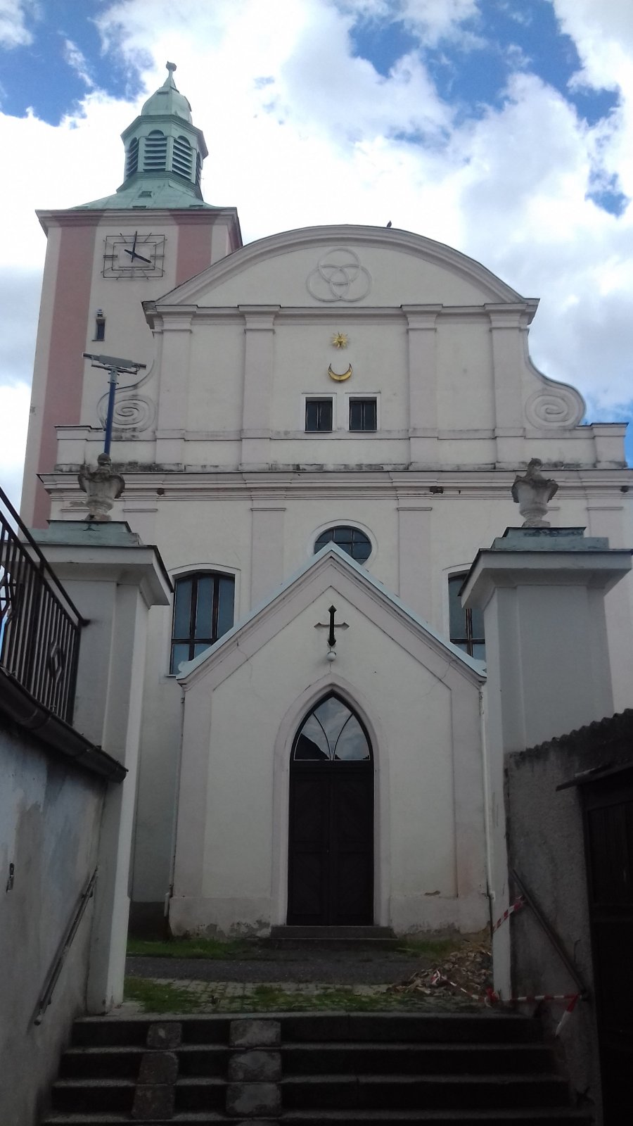 Kostol má v pôdoryse tvar nepravidelného štvorca v severnej časti s mohutnou štvorbokou vežou a polygonálnym presbytériom. V južnej časti lode je sakristia a kaplnka, v osi západného priečelia sa nachádza predsieň. Na tomto západnom priečelí sa nachádza polmesiac a hviezda, sú to symboly vtedajšieho vlastníka grófa Tarnovského. Vpravo u predsiene vstupu do kostola je umiestnená socha sv. Pavla. Presbytérium je neskoro gotické, má krížové zaklenutie s paprskovou klenbou, medzi opornými pilierami má kružbové okná.
