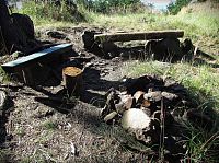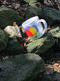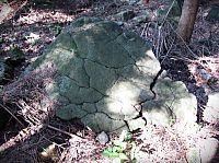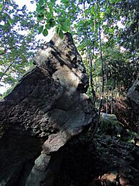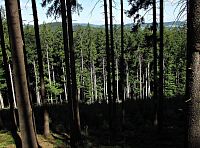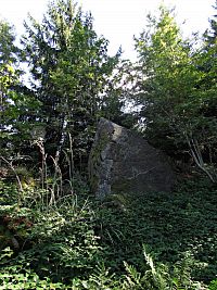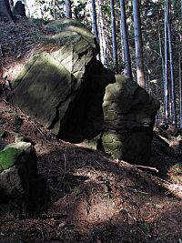 Moje další trasa vedla směrem k Humenci. Zbytečně sestupovat dole na modrou se mi nechtělo, protože jsem věděl, že se od vrcholu k západu táhne úzký hřeben, při jehož konci jej tur.trasa „dožene.“ Nejprve jsem se musel protáhnout mezi jehličnany hustšího lesa, pak už jsem stanul na okraji hřebínku. Tady mne přivítal hraničník panství pocházející z roku 1886 a za ním po hřebeni procházela pěšina. Záhy mne přivedla k okraji asi 40 metrů dlouhého mrazového srubu, z nějž mezi balvany vystupovaly až 4 m vysoké skalky. Úbočí mrazového srubu spadající na jedné straně k jihu a na druhé k severu, byla pokryta kameny balvanových proudů. Na konci mne překvapilo, jak je tento skalnatý hřebínek uzoučký. Směrem k půlnoci jsem pod sebou viděl chodník tur.modré trasy a na opačné lesní asfaltku rovněž o kus s níž ve svahu kopírující hřeben... a přitom tyto cesty od sebe nedělila vzdálenost větší jak sto metrů! Příjemnou vzpruhou po průzkumné fušce byl „objev“ Studánky Pod Vysokým grúněm, jejíž chladivá tekutina mi dodala sílu k další pouti.