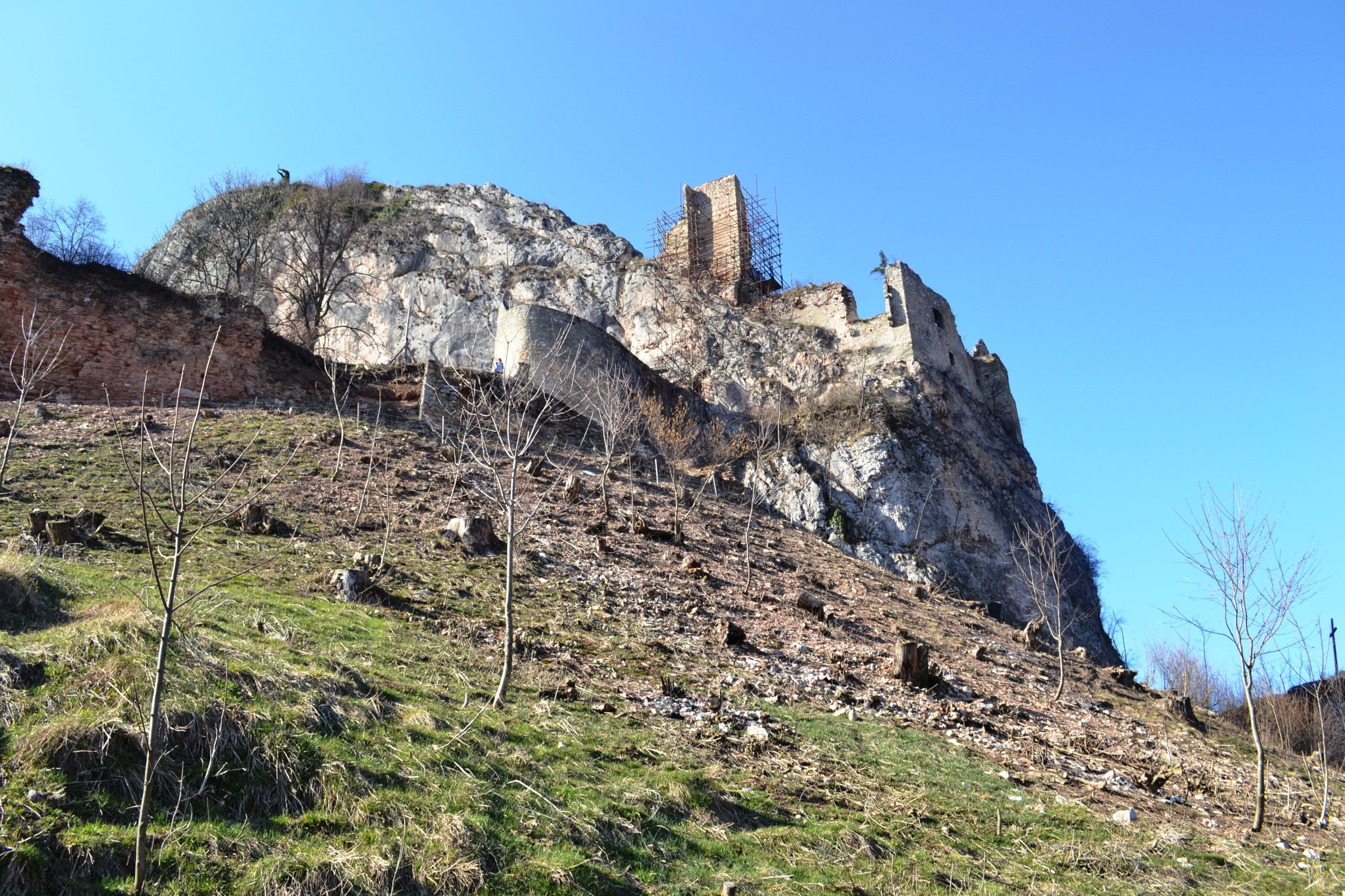Po prečítaní týchto informácii sme začali stúpať k hradu, ktorý bol oplotený a prebiehajú na ňom výkopové a rekonštrukčné práce. Dostali sme sa ku vchodu, ktorý bol zatvorený. Pred pár rokmi sme tu boli a dostali sme sa chodbou na nádvorie a odtiaľ s jednou dcérou po rebríku na horný hrad a po vytesaných schodoch až k strážnej veži. Dnes sa do zrúcanin hradu nedá dostať. Ktovie aká bude situácia za ďalších desať rokov. Vydali sme sa teda popri hrade k bralu. Dievčatá zostali na chviľku pri zrúcanine a pokochali sa pohľadom na obec náprotivné kopce a potom sa vrátili ku vchodu do hradu. Ja som obišiel celé bralo a stretli sme sa pri Katkinom prameni.