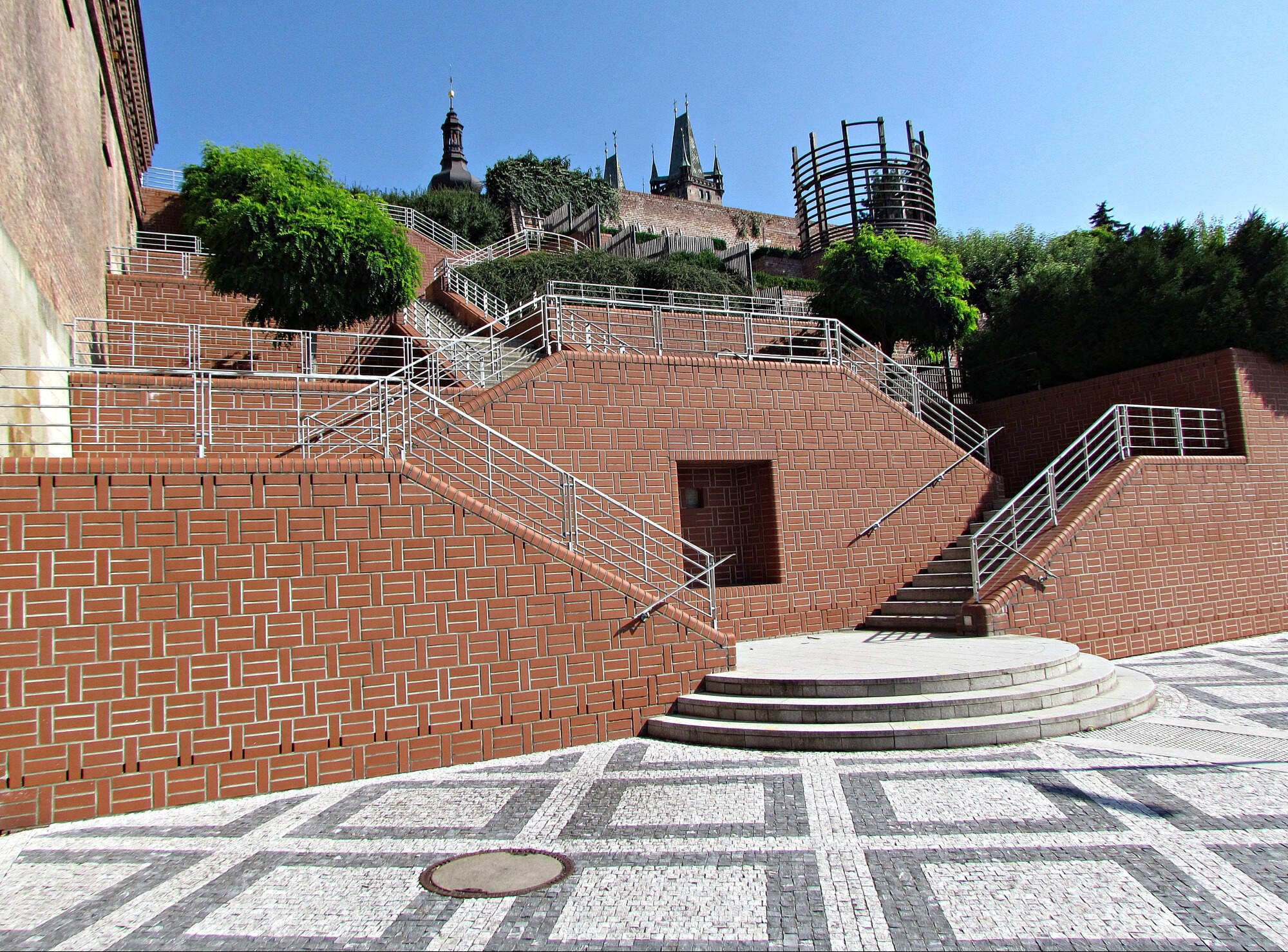 Pro rekonstrukci musely být vyrobeny speciální „gotické“ cihly, které – aby získaly starobylou patinu – prošly otryskováním. Stejně tak bílé spárování mezi nimi je přesnou napodobeninou toho původního. Stavaři části hradeb opravili, některé hořejší znovu dostavěli a nad terasy a schody umístili dřevěnou pergolu. Byly doplněny chybějící části schodišť, zbudovány nové chodníky a terasy oživeny nově vysázenými stromy a velkými květináči se zelení. Krášlí je i novodobá hranolová fontána a otevřený kruhový altán. Kromě ústředního schodiště jsou terasy propojeny třemi dalšími, už užšími schody.