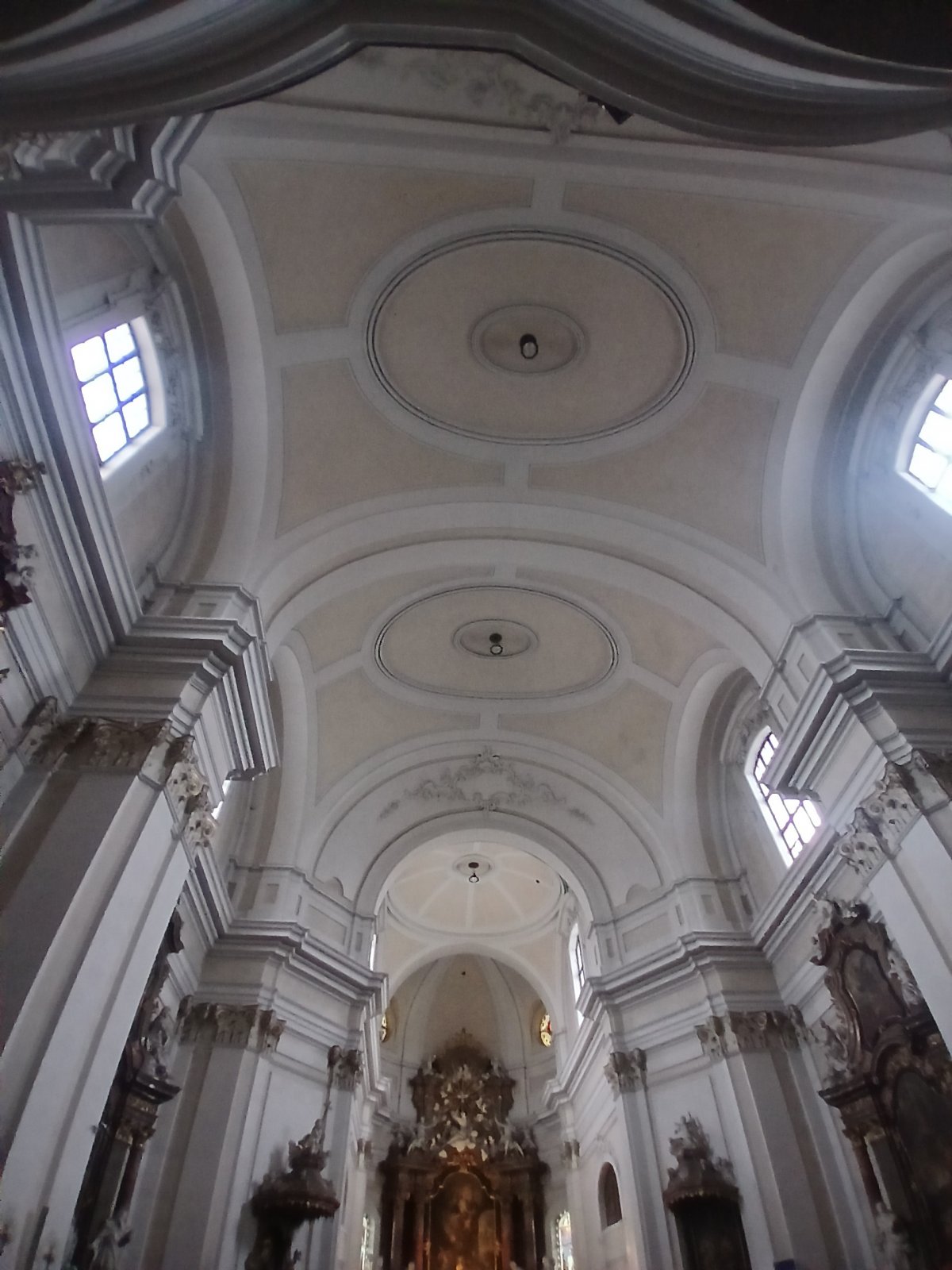 jeden z bočných oltárov, odložená poškodená hlavica a jeden drevený obraz krížovej cesty