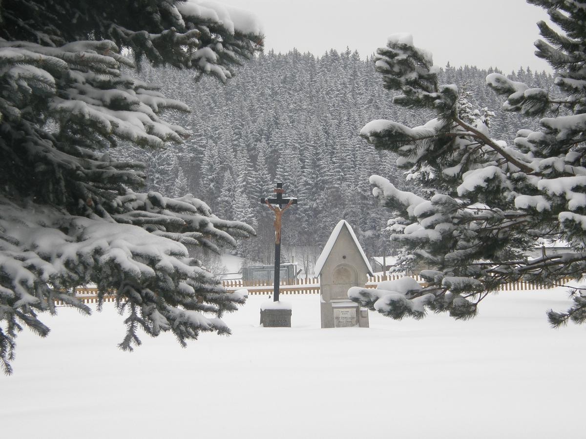 Ani Kvilda se nevyhnula tomuto pokusu. Dlouhá cesta, kterou museli zdejší občané absolvovat v případě křtu, svatby i pohřbu až do vzdáleného Rejštejna, přiměla majitele panství Velký Zdíkov Vilém Malovce v roce 1765 k vybudování dřevěného kostela na Kvildě. No a u něho vnikl i malý vesnický hřbitůvek. V roce 1889 při velkém požáru Kvildy lehl popelem zmiňovaný kostel, jenž byl ještě téhož roku nahrazen malým nouzovým Kostelíkem. Na výstavbu tohoto byť provizorního, přesto však posledního dřevěného objektu v obci, bylo použito dřeva z bývalého objektu Hraběcí Hutě, stávajícího při cestě z Kvildy k pramenům Vltavy. Hřbitov však žil dále. Teprve léta poválečná a uzavření hranic způsobilo odliv obyvatelstva z Kvildy. Odsun Němců, následné neúspěšné snahy o osidlování pohraničí a vybudování „železné opony“ zredukovali počet obyvatel Kvildy na minimum. Z více jak jeden a půl tisíce lidí, tu zbylo jen pár rodin. Snad tehdejším mocipánům připadalo, že obec zanikne sama od sebe. Zřejmě zapadalo do jejich plánů vymazání obce z povrchu zemského. Jak jinak si vysvětlit jejich pokyn z roku 1978, který přikazoval likvidaci zdejšího hřbitova? Pomsta, či nějaká podivná „kratochvíle“ tehdejších „soudruhů“? Těžko říci. Dnes víme jistě jen pár věcí. Hřbitov byl v roce 1978 rozbourán, kovové i litinové kříže putovaly do tehdejšího národního podniku Sběrné suroviny, zatímco Kamenné náhrobky zmizely v tehdejším hraničním pásmu – v prostoru bývalé Hraběcí Hutě.