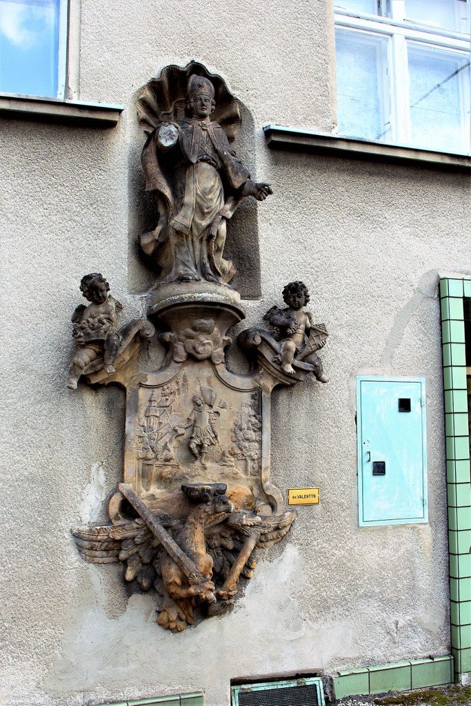 Procházet Tržním náměstím ve městě Hrobu a neprohlédnout si sochy světců není snad ani možné. Je jich tu několik a některé jsou více než unikátní. Navíc socha sv. Valentýna skrývá i hádanku. V některých průvodcích a knihách o památkách v tomto městě se uvádí, že se jedná o sochu sv. Prokopa. Na stěně u sochy samé je ale tabulka nesoucí jméno sv. Valentýna. Člověk zvídavý chce jistě znát správnou odpověď. Po zapátrání v paměti lze vydolovat něco málo o našem světci. Sv. Prokop bývá zobrazován jako řeholník v mnišském oděvu. V ruce mívá berlu nebo knihu a má často mitru. Od 17. století to může být i kříž a někde by měl být i přemožený ďábel. Sv. Valentýn žil někdy ve 3. století a byl biskupem. Jeho atributy by měly být ptáci, růže a dívka s ratolestí. Někdy bývá zobrazován s ochrnutým dítětem. Při pohledu na sochu samotnou by se mohlo přeci jen jednat o sv. Valentýna. Socha stojí v nice, ale chybí jí pravá ruka. Zda v ní něco bylo, popis neříká. Pod sochou na stranách jsou dva andělé nesoucí zřejmě ovoce. Následuje reliéf se sv. Floriánem s držákem na lampu a pod sochou je orlice držící dva meče, z nichž je jeden poškozený. Když se to všechno shrne lze tvrdit, že to sv. Prokop jistě není. Zda je to sv. Valentýn bych si tvrdit netroufal, ale co je psáno to by mělo přece jen platit. Socha je z období baroka, uvádí se rok 1734 a patří k těm nejhezčím na náměstí.