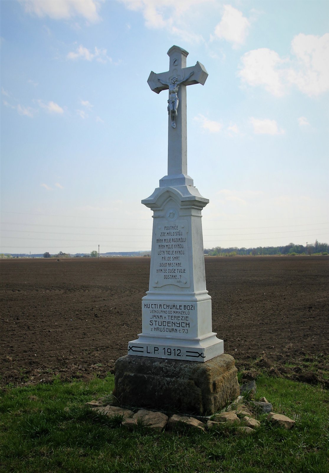 Nejkratší spojnice mezi hrušovanským nádražím a náměstím v Židlochovicích vedla vždy polní cestou směřující za hrušovanským Obecním rybníkem od říčky Šatavy k rohu Zámeckého parku. U cesty v poli stával od roku 1912 kamenný kříž, který zde svým nákladem nechla postavit rodina Studených z Hrušovan. Asi po vybudování silničního obchvatu, který slouží i jako protipovodňová hráz, došlo k posunu této cesty. Tím se kříž ocitl náhle uprostřed pole. V roce 2014 bylo rozhodnuto zrestaurovat kříž a posunout jej ke stávající cestě při úpatí nové komunikace. Na kříži je mimo jiné i veršovaný nápis: "Poutníče zde málo stůj, rány moje rozvažuj! Rány moje kynou, léta tvoje hynou. Příjde smrt. Soud nastane. Kam se duše tvoje dostane?"