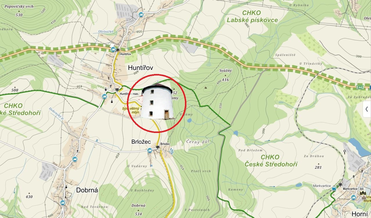 Obec Huntířov se nachází v okrese Děčín a žije zde asi 750 obyvatel. Nachází se zde dvě pamětihodnosti. Venkovská usedlost čp. 13 a větrný mlýn na Františkově vrchu. První zmínka o zdejším větrném mlýnu je z roku 1843, kdy byl zanesen na katastrální mapu a u ní se objevuje i jméno prvního majitele. August Michel mlýn vystavěl spolu se svým synem Wenzlem. Tehdy se však jednalo jen o dřevěnou stavbu. Po třiceti letech je mlýn postaven z kamene a od 12.řijna 1876 je v něm započato mletí. Mlýn stojí u silnice do Brložce. Asi 0,5 km jihovýchodně od Huntířova. V 70. letech 20. století byl mlýn značně snížen, zbaven lopatek, pokryt sedlovou střechou a používal se ke skladování sena. V letech 2000 - 2001 byl mlýn zrekonstruován a slouží nyní k obytným účelům.