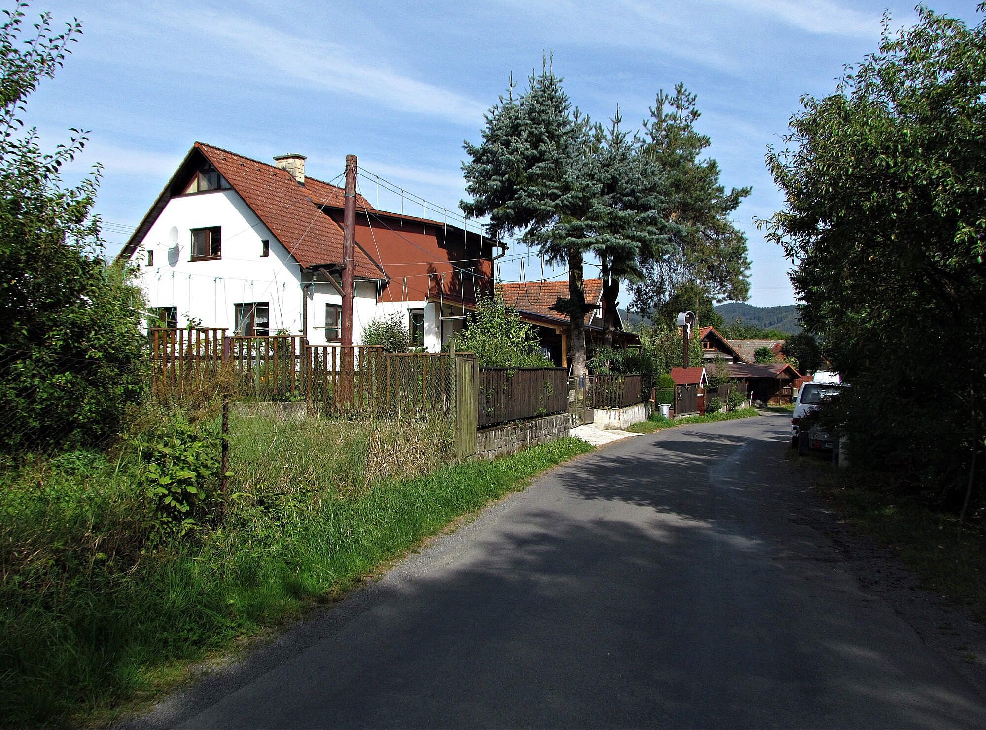 Za domem se zahradou stojí menší kaple, zrobená rovněž z drva, se sedlovou střechou.