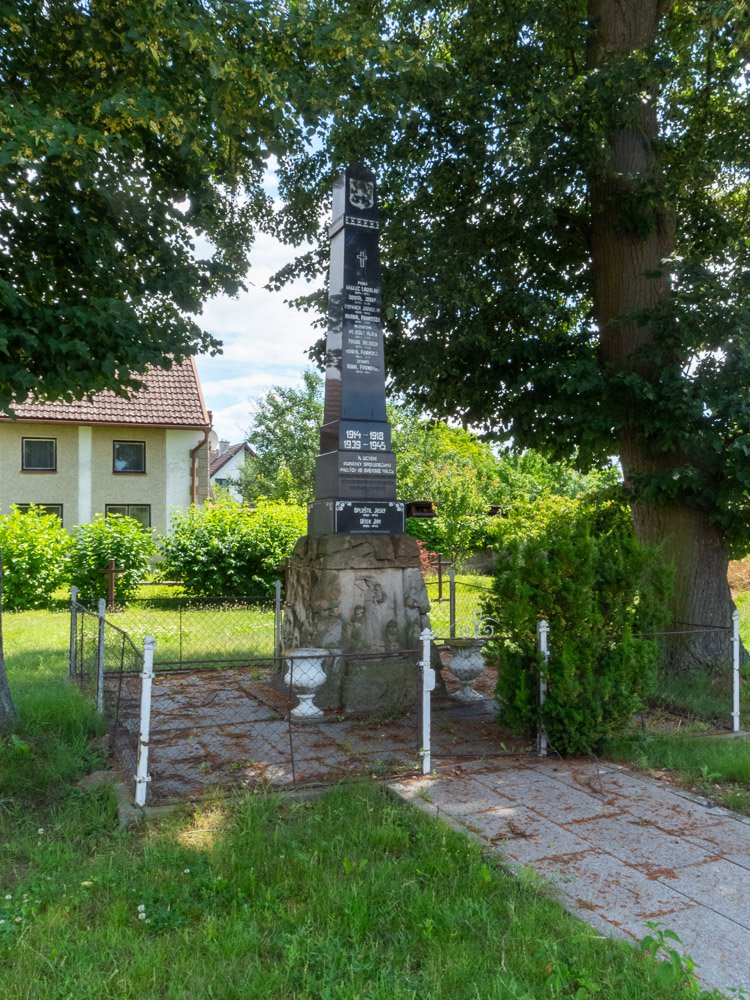 Pomník tvoří kamenný podstavec z lomových kamenů. Na čelní straně podstavce je reliéf marně čekající ženy s dětmi. Na podstavec navazuje v několika stupních obelisk s leštěného červeného kamene s ozdobami v bílém provedení i s výčtem obětí válek. V horní části je uvedeno 8 jmen padlých z první válečné vřavy. Vrchol obelisku je zakončen ozdobným pásem vejcovce a znakem Československé republiky.