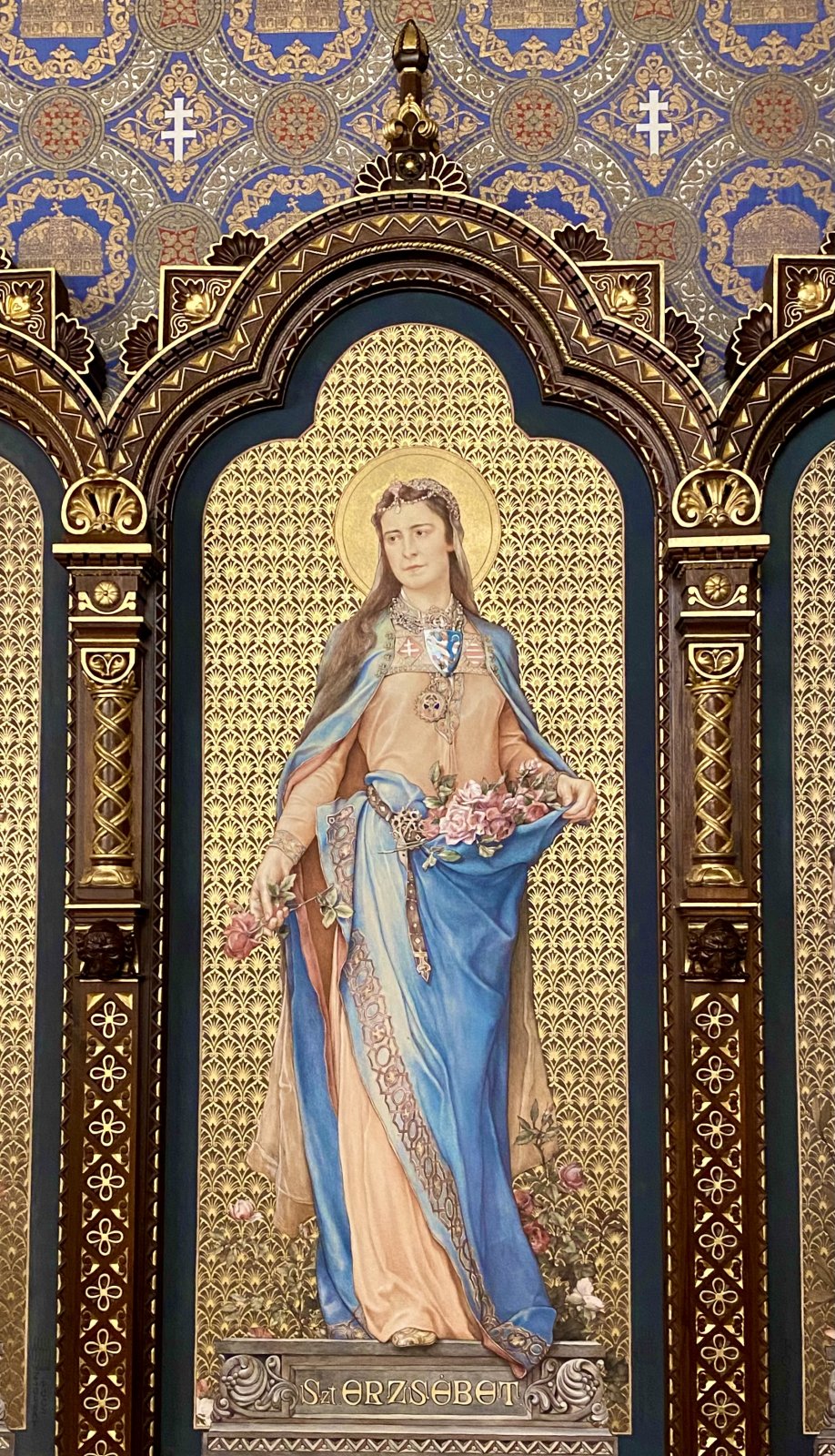 Na dekorativně pojatém krbu stojí busta sv. Štěpána.