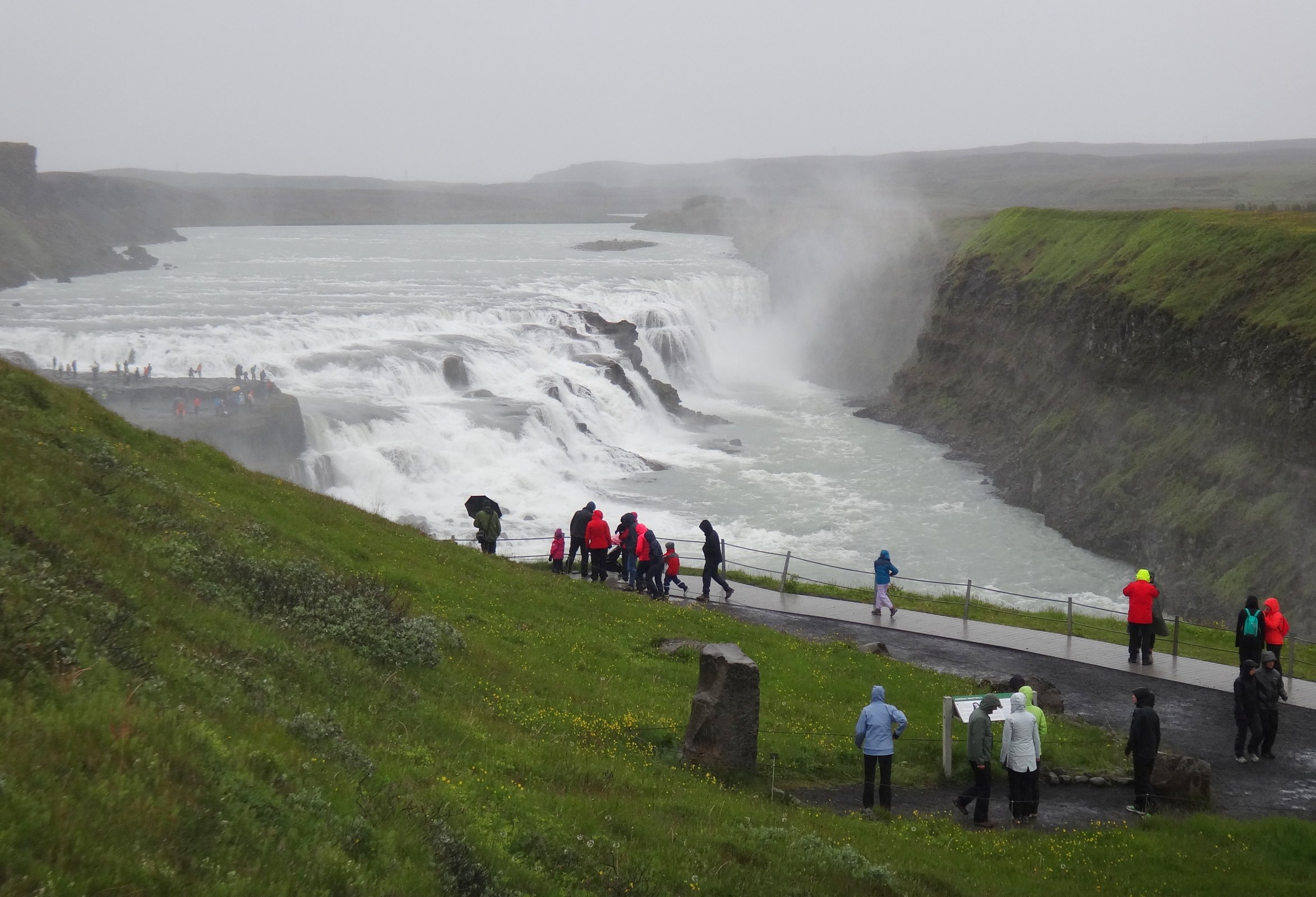 Z parkoviště jdeme dlážděnou cestičkou k vodopádu Gullfoss a v polovině cesty se zastavujeme u pomníku Sigrídur Tómasdóttir, ženy, která se zasloužila o zachování této nádherné oblasti. Sigrídur se narodila 24.2.1871 v Brattholtu a také celý svůj život zde žila. Byla druhým nejstarším dítětem ze 13 dětí Margrét Pórdardóttir, ženy v domácnosti a farmáře Tómase Tómassona. Pouze sedm se dožilo dospělosti a když nejstarší sestra a jediný bratr odešli v raném věku z domova, stala se vůdčí osobností dětí. Turisté k vodopádu Gullfoss začali chodit již kolem r. 1875, ale vodopád byl těžko dostupný, kvůli nerovnému terénu a neprůchodným řekám. Sigrídur zde nechala udělat první cestu a sama se stala průvodkyní turistů. Když v 19. stol. na vodopádu chtěli zahraniční investoři vybudovat hydroelektrárnu, podařilo se jí s pomocí právníka vodopád zachránit. Říkala, že jinak z elektrárny skočí dolů. Vodopád byl zachráněn a stal se majetkem lidu Islandu. Sigrídur zemřela na podzim r. 1957 ve svých 87 letech. R. 1979 jí byl u vodopádu postaven pomník a autorem portrétu Sigrídur je sochař Rikhardur Jonsson.
