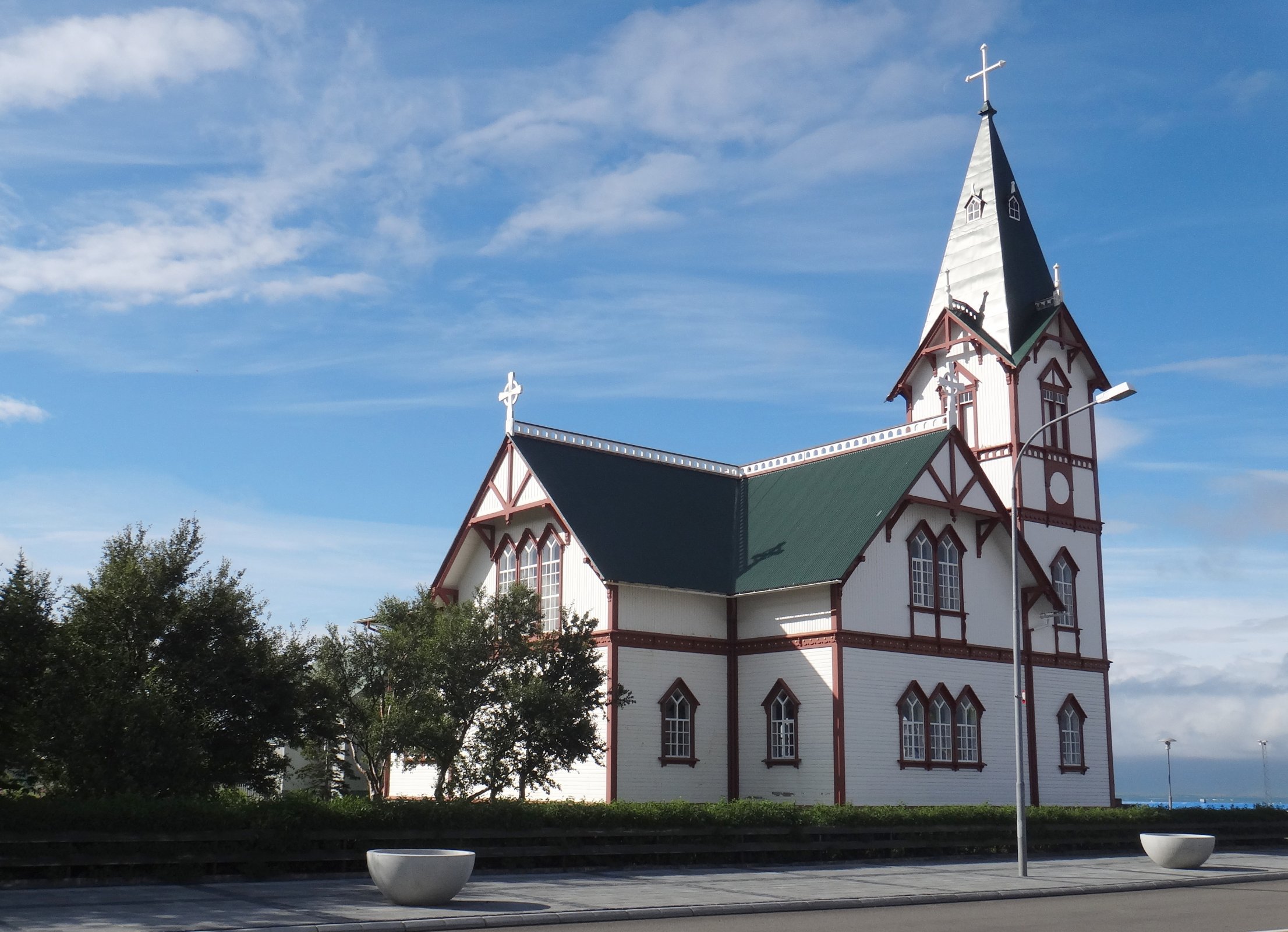 Ještě než vyjíždíme na pozorování velryb stihnu v Húsavíku zajít do kostela. Kostel byl postaven podle návrhu architekta Rognvaldura Olafssona ve tvaru kříže ze dřeva dovezeného z Norska. Má 26 m vysokou věž a vysvěcen byl 2.6.1907. Je zcela odlišný od jiných kostelů na Islandu, protože nemá kazatelnu. Interiérová výzdoba kostela je dílem Freymodura Johannessona (malíře a dekoratéra) z r. 1924. Další umělec Sveinn Thorarinsson, umělec z farmy Kilakot v kraji Kelduhverfi, je autorem oltářního zobrazení Vzkříšení Lazara (1930-31). Další řezbářské práce provedl sochař a řezbář Johann Bjornsson z Húsavíku. Varhany byly instalovány až v r. 1964. Bílo-červený kostelík se zelenou střechou tak trochu připomíná kostelíky v Alpách.