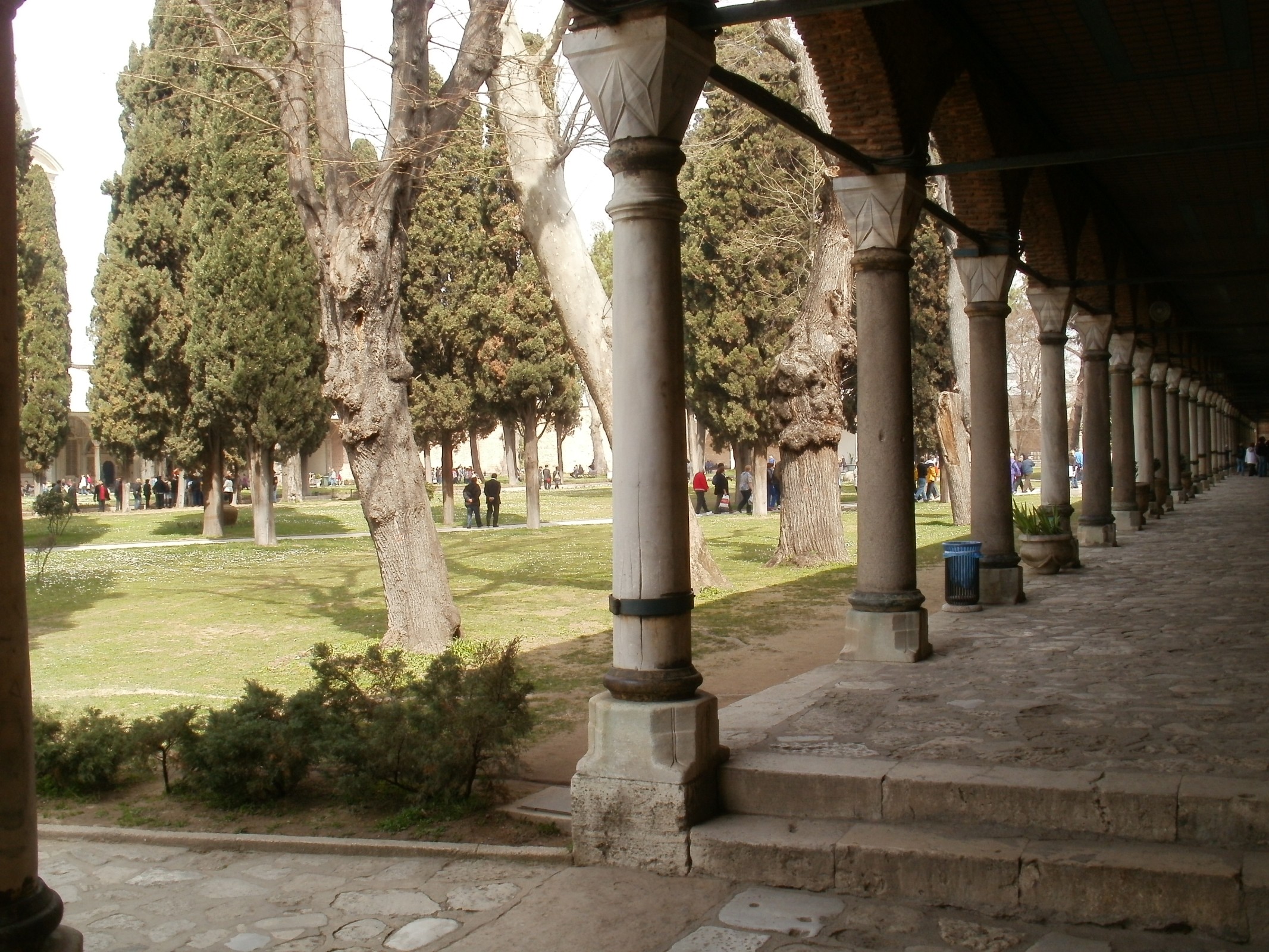 Druhé nádvoří Topkapi vypadá jako velká obdélníková zahrada.