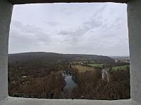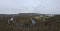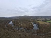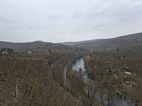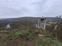 Betonový altán nabízí romantické výhledy do okolní krajiny a kroutící se řeku Jihlavu. Vidět je částečně také zmíněný Stříbský mlýn, kde jsem před chvílí byl a město Ivančice, kam se chystám. Je zajímavé, že rozhlednička je celkem vzdálená od obydlených míst, ale přesto se k ní někdo vydal a posprejoval jí.
