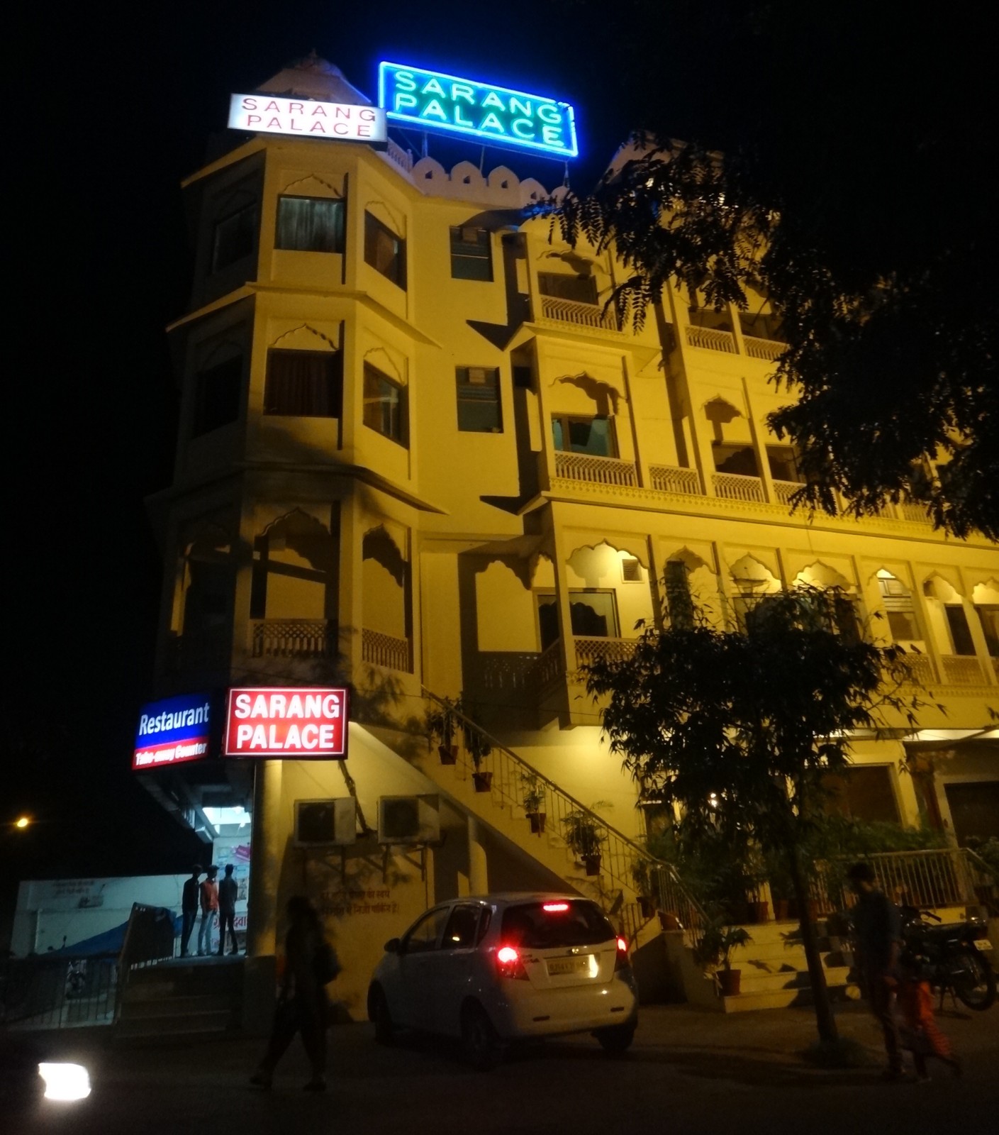 Ve městě Jaipur jsme byli ubytováni v tichém hotelu Sarang Palace. Protože jsme téměř vždy přijeli na ubytování večer, tak rychle se trochu opláchnout a hurá na večeři. Útulná jídelna byla v přízemí a vcházelo se do ní z hotelové haly od recepce, jídlo podáváno formou bufetu. Pokoj jsme s kamarádkou měly dvoulůžkový s oddělenými postelemi, čistým povlečením a sociálním zařízením a nezbytným vybavením - skříň, stůl, TV, telefon, balená voda. Chodby hotelu hezky vyzdobeny obrazy, květinami a venkovní stěny světélky k oslavě svátků Diwali. Při příjezdu i odjezdu se o zavadla postarali zaměstnanci hotelu.