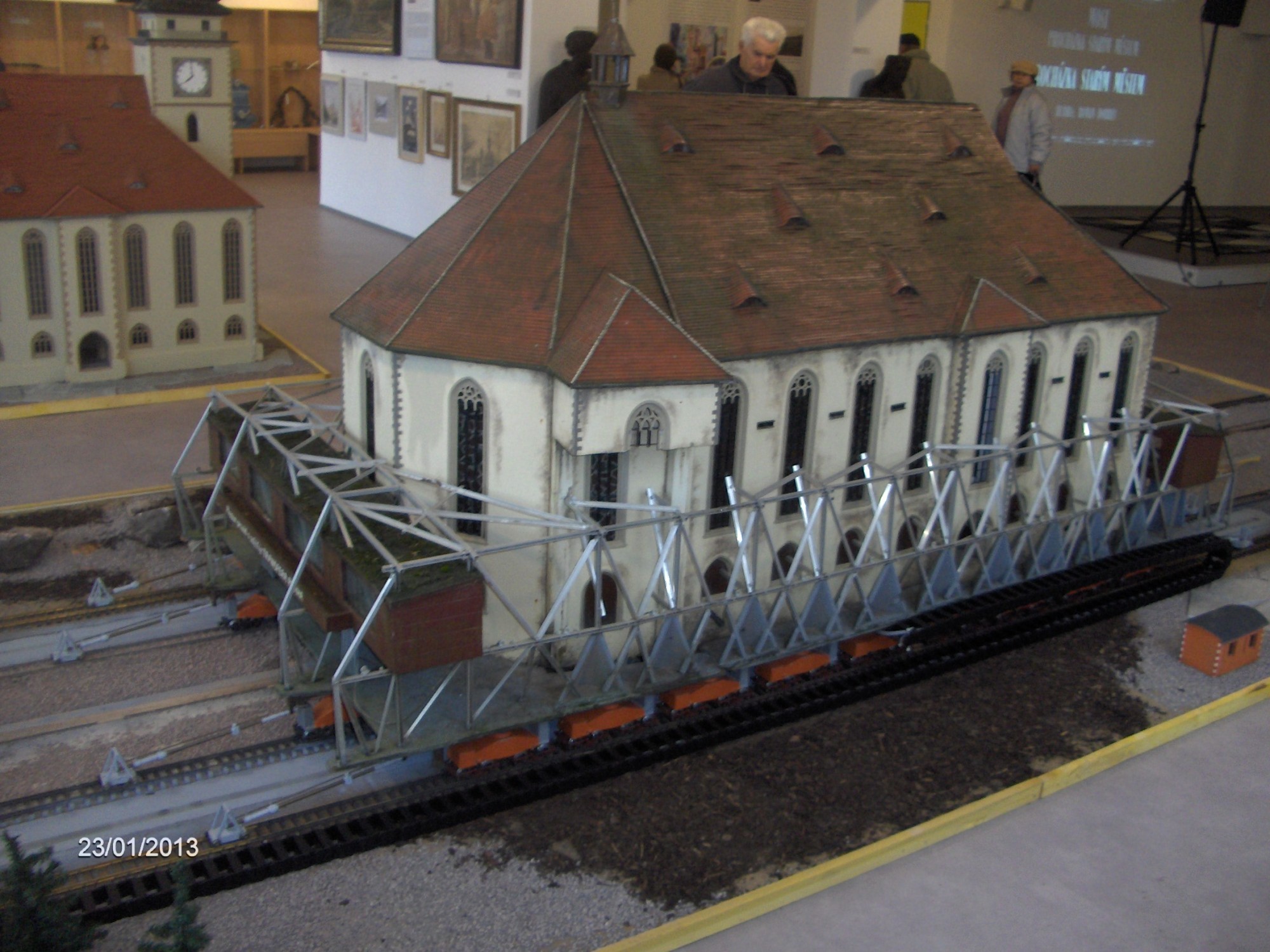 Pohyblivá maketa přesunu Děkanského kostela je dominantou výstavy. Ukazuje přesun kostela, který se uskutečnil v roce 1975 na nové místo vzdálené 850 metrů. Ukázku doplňují dobová zvuková hlášení. Tato maketa je zapůjčena z Parku miniatur v Oederanu v Sasku.