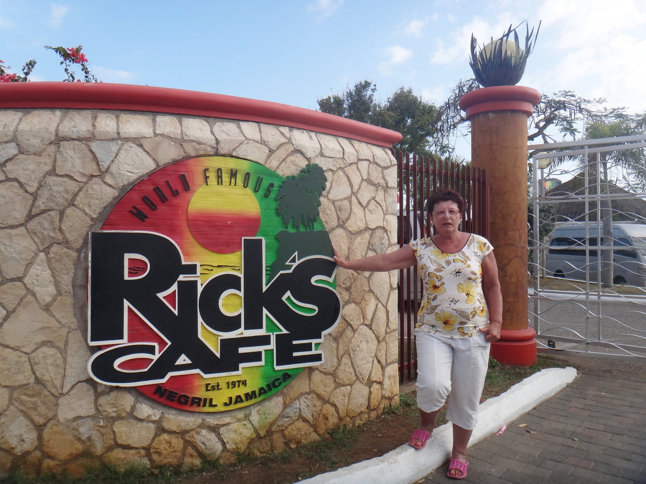 Rick´s Café se nachází 2,5 km od centra města a od našeho hotelu asi ještě o km dále. Jedeme před čtvrtou hodinou odpolední taxíkem za 6 jamajských dolarů s domluvou, že pro nás zase přijede kolem sedmé. Kromě baru a restaurace, kde se dobře najíte (ceny jsou trochu vyšší),se účastníme mnoho aktivit. Nejdříve se jdeme podívat na stále funkční maják a následně na skoky do vody. Skáče se z mnoha pozic, z ochozu kolem schodišť a cestiček, ze skákacích míst a také z plošiny, která je umístěna na vrcholu sloupu. Skáče se do uzavřené zátoky obklopené jeskyní. Prolézáme barem a restaurací, díváme se na skalní útesy na druhé straně a účastníme se všeobecného mumraje. Pak se jdeme vykoupat do bazénu a končíme tancem při živé hudbě. Zlatým hřebem večera má být západ slunce, ale neměli jsme moc štěstí, byly mraky.