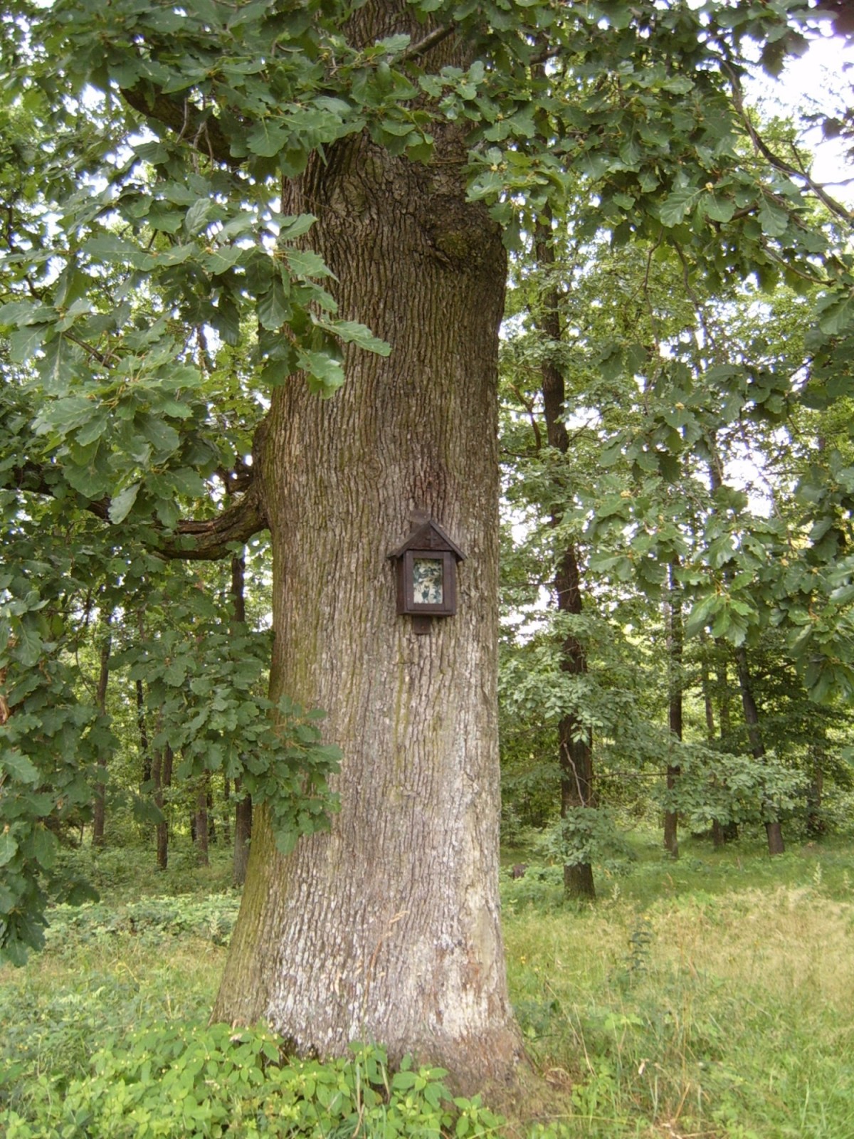 Svatý obrázek- Sv. František z Assisi visí na výrazném dubu pár metrů od asfaltky s cyklotrasou v hloubi lesa na křižovatce lesních cest,