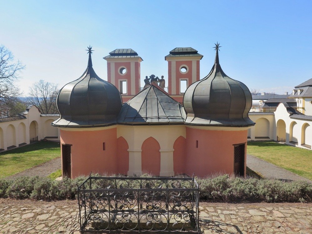 Barokní poutní areál na hoře Kalvárie nad Jaroměřicemi u Jevíčka je místem natolik zajímavým i půvabným, že by se o něm daly popsat desítky stran, a pro některé nadšence by se mohlo jistě stát i tipem na celodenní výlet. Vždyť zde najdeme nejen kostel Povýšení sv. Kříže, jehož dynamické baroko přivedlo mnohé odborníky k názoru, že se jedná o stavbu věhlasného Santiniho, ale i vstupní bránu se sousoším Ecce Homo, kostelní přístavbu známou jako Getsemanská zahrada, kapli Božího hrobu, pod níž se nachází podzemní kaple Betlémská se třemi velmi kvalitními reliéfy Narození Páně, kaple hrobu Panny Marie a tzv. Kámen pomazání těla Kristova.