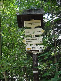 Za sedlem jsem pak směrem k velké obci Hovězí kráčel po několik set metrů dlouhé výhledové pastvině, odkud mi při zpětním pohledu zdáli kynulo temeno mé milované Makyty (923 m), za Papajským sedlem navazující na hlavní hřeben Javorníků. I z něj odtud byly některé vrcholky též vidět. Požitek z okolní nádherné krajiny jen na chvíli zastínila myšlenka na tur.rozcestník Stříbrník, který jsem minul při sestupu k sedlu. Jeho cedule sice správně označuje jeho nadmořskou výši (573 m), ale samotný rozcestník je zcela nepochopitelně umístěn nikoliv v sedle, ale o 150 metrů chůze výš při asfaltové silničce. Po ní ale žádná cyklostezka neprochází...