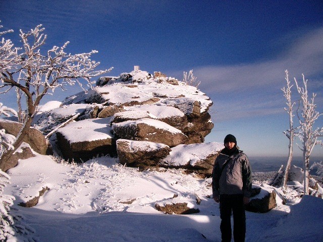 Sestupujeme dolů příkřejším svahem a podél el.vedení se dostáváme až k skalním masivům Medvědí skály - kamenu. Je zde pěkná vyhlídka do celého okolí.Kdysi tu stával srub/zbytky jsou ještě patrny/.Na kamenu by měla být deska s upozorněním,že zde byl zabit poslední medvěd v Krušných horách/já ho v zimě nenašel,bohužel ani dnes 24.5.2009 tu nikde deska nebyla!!!l/.Je zde taky skrýš GPS /keška/.
