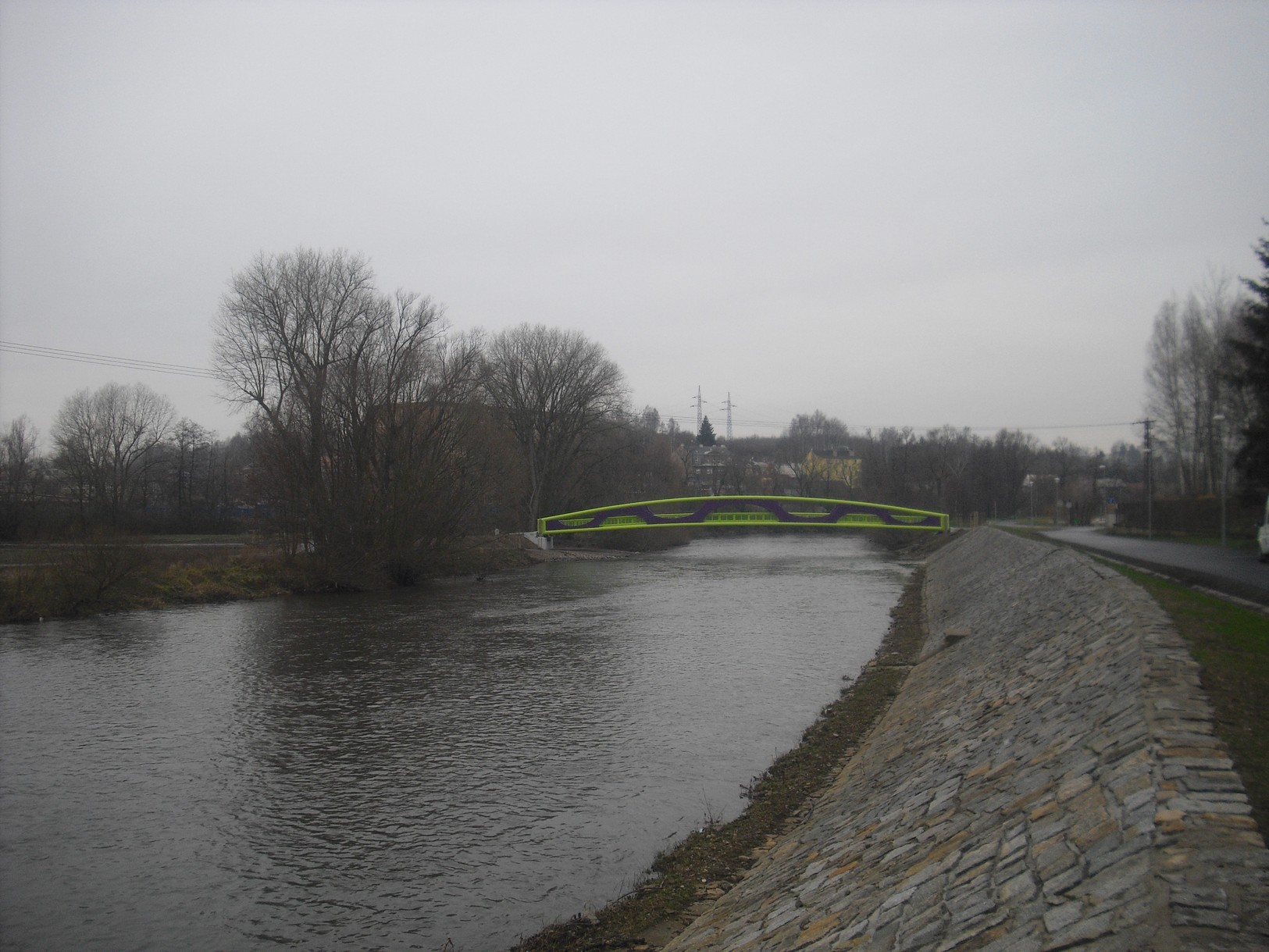 Lávka, která je určena pro pěší i cyklisty, spojuje rekreační areál v meandru řeky a protější páteřní cyklostezku u obchodního centra Varyáda. Navrhl ji městský inženýr, projektant Ota Řezanka tak, že svými výraznými barvami i tvarem je opravdu nepřehlédnutelná. Světle zelená, fialová a tyrkysová upoutají každého. Někoho příjemně, někdo používá výrazy jako pouťová atrakce.