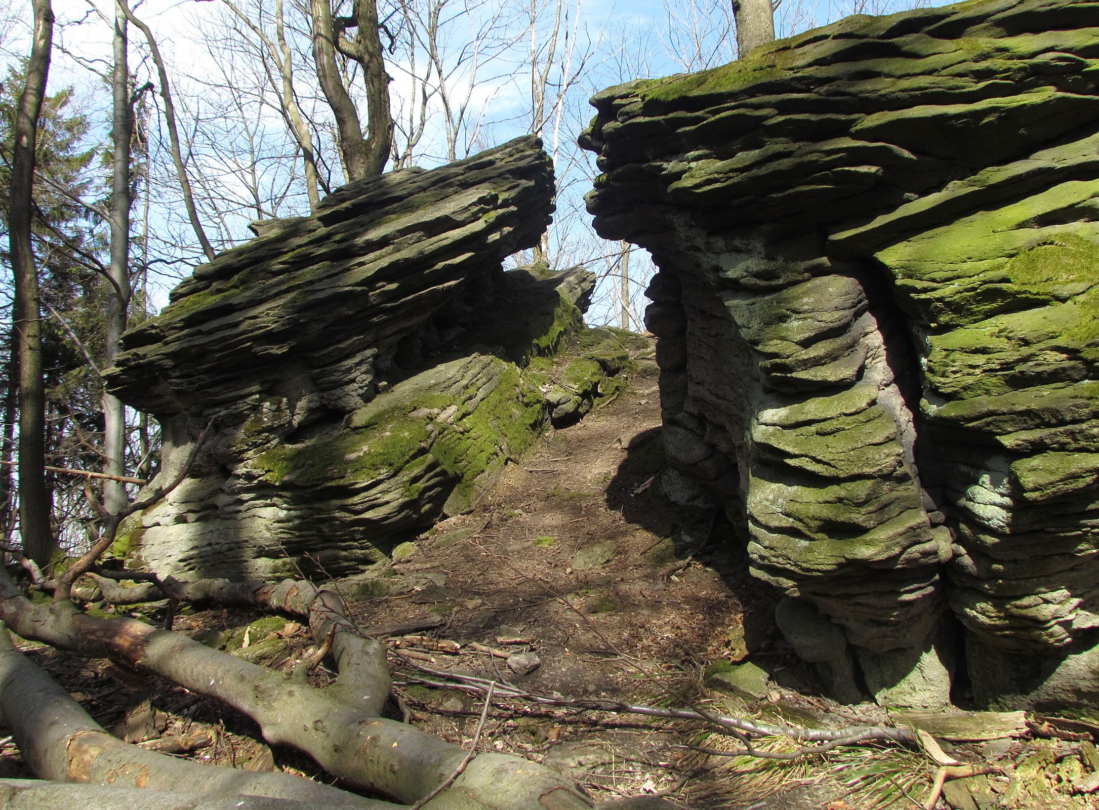 Ke Kelčskému Javorníku je to od rozcestí na Jehelníku po zelené značce 600 metrů pohodové chůze lesem už bez většího stoupání. V necelé třetině narazíte na rovinatém hřebeni na dvojici fantasticky vypreparovaných skalek, jež jsem už kdysi hrozně dávno pokřtil na „Dvojčata.“ Tenké pískovcové a slepencové skalní lavice jsou zde na sebe vyskládány jak žebroví radiátoru a z turistického chodníku se na ně otvírá moc hezký pohled. Skalky jsou součástí magurského flyšového pásma, v tomto případě jsou tvořeny rusavskými vrstavmi zlínského souvrství. I když jsou skalečky nesmírně malebné (a já si je za opravdu skvělého osvětlení zrovna fotil), přešlo okolo za deset minut asi padesát turistů a podíval se na ně jen jeden jediný! Ostatní totiž tak spěchali k té nové Rozhledně, že jim na koukání na to, okolo čeho procházejí, prostě nezbyl čas!!