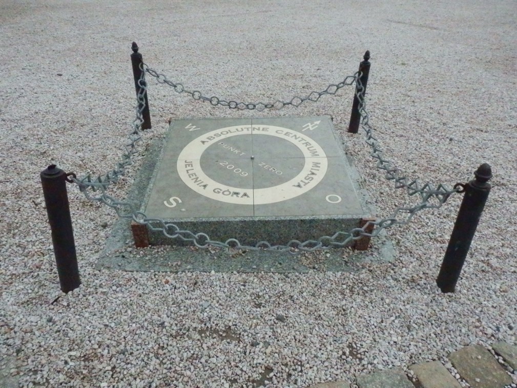 A právě u něho v parku, který dříve býval hřbitovem, najdete hledaný absolutní střed města. Tvoří ho čtvercová deska z kamenných dlaždic ohraničená železným řetězem zavěšeným na čtyřech kovových sloupcích. Nápis ABSOLUTNE CENTRUM MIASTA, JELENIA GÓRA i PUNKT ZERO jsou napsány polsky, zkratky světových stran anglicky. V kameni je vyznačený i rok pořízení této turistické zajímavosti 2009.