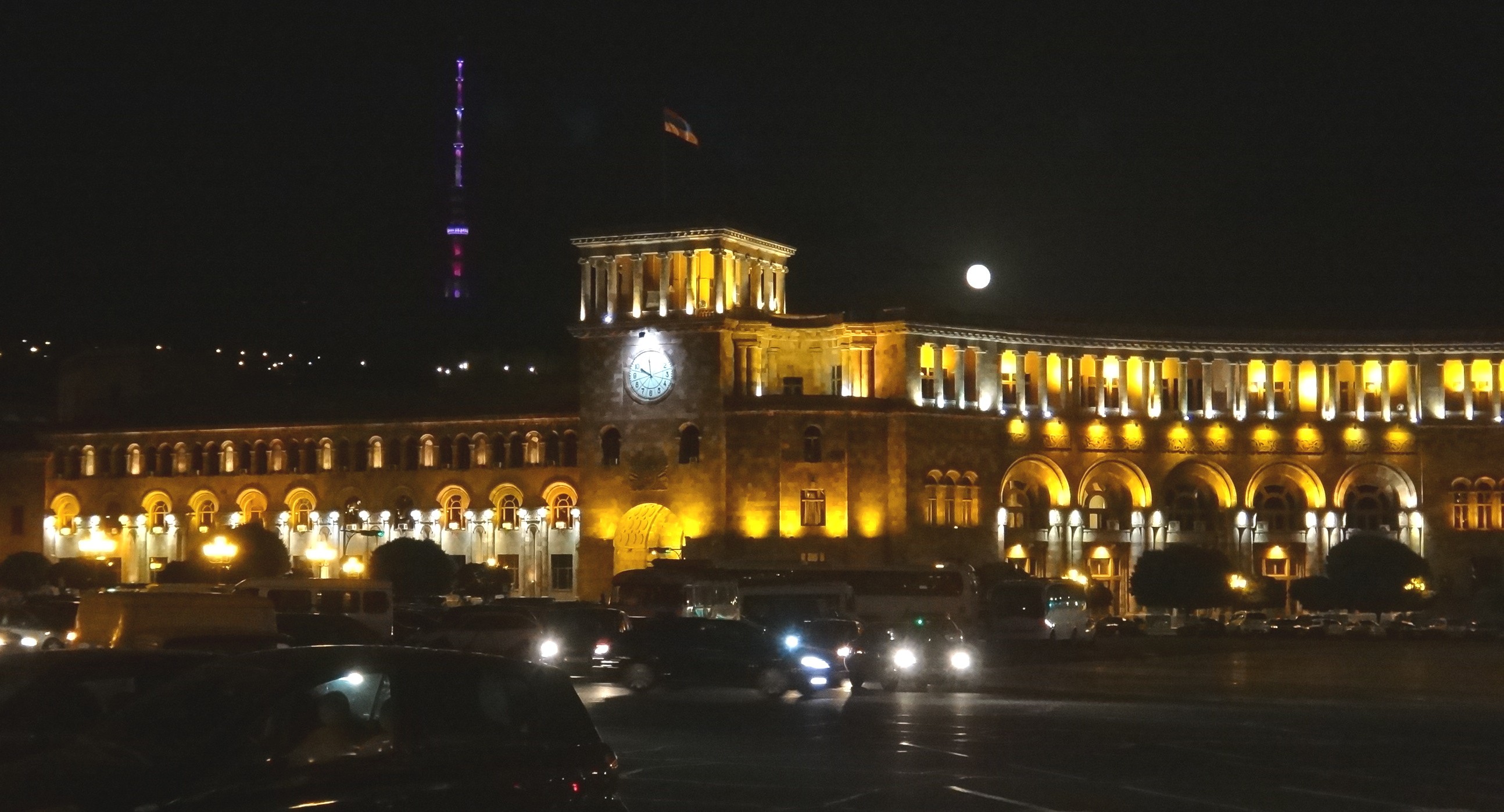Hned první večer v Arménii a hlavním městě Jerevanu vedly naše kroky na ústřední náměstí na Náměstí Republiky, které je zároveň místem setkávání obyvatel města, konání obřadů a oslav. Náměstí má kruhový tvar a jsou na něm všechny významné budovy - Úřad vlády, Ministerstvo zahraničí, Muzeum historie, Národní galerie, Ústřední pošta, Ministerstvo Dopravy a spojů a hotel Mariott Armenia. Všechno, co bylo na náměstí dříve, bylo zbouráno a v r. 1926 se začalo s výstavbou zcela nového náměstí podle návrhu architekta Alexandra Tamaniana. Dokončeno bylo r. 1929, v letech 1952-1958 byla provedena jeho přestavba. V dobách SSSR to bylo Náměstí Lenina a stála zde také jeho socha, která byla přenesena do dvora muzea. Byl zde i pomník carevny Kateřiny II.