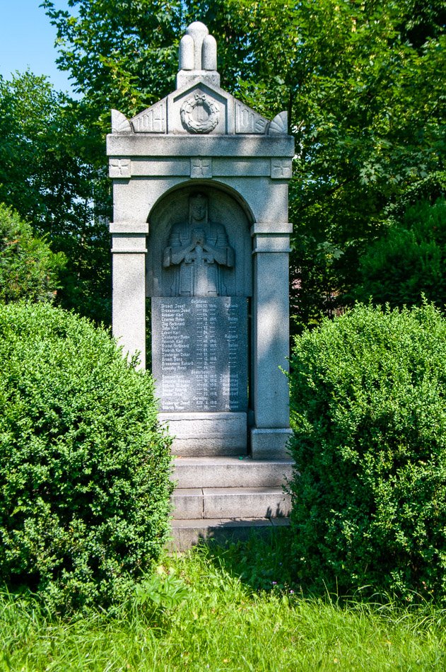 Původně byl pod touto deskou větší nápis HELDEN DANK (tedy Díky padlým), který se nedochoval. Nověji byla na toto místo umístěna deska s dodatkem OBĚTEM II. SVĚTOVÉ VÁLKY bez dalšího výčtu.