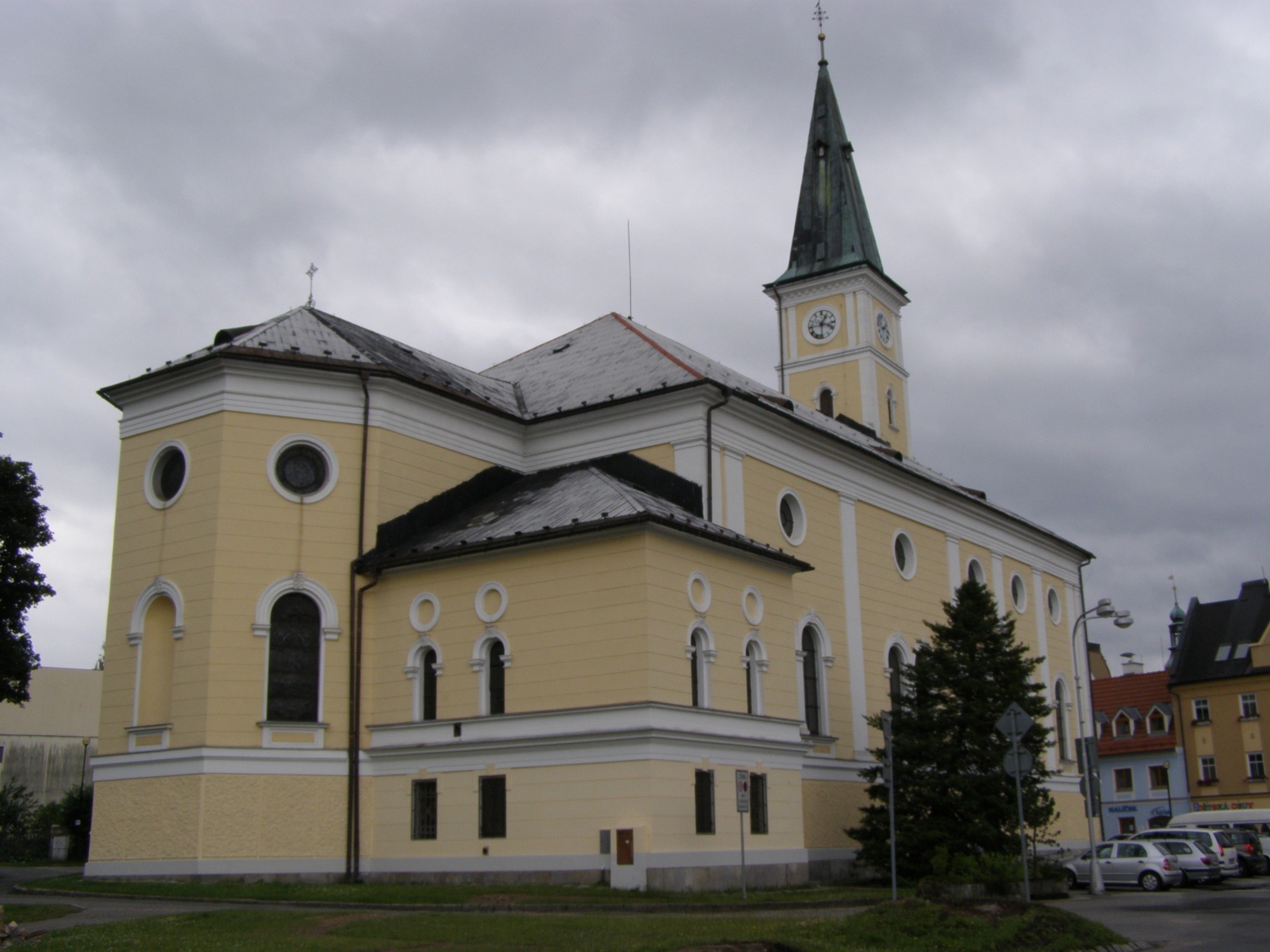 Při pohledu z Masarykova náměstí východním směrem upoutá štíhlá a vysoká jehlancovitá věž. Ta patří k výše jmenovanému kostelu, který je jednou z nejmohutnějších sakrálních památek v této oblasti. Z náměstí se ke kostelu projde Palackého ulicí na Zámecké náměstí a v jeho JZ části jsme u cíle. První písemná zmínka o kostele je z roku 1418 a další z roku 1457, kdy je psáno o jeho obnově. Uvádí se, že kostel byl poměrně malý a sloh, jak jinak, gotika. Kostel třikrát vyhořel, naposledy to bylo v roce 1737. Po každém požáru ale zůstaly klenby. V roce 1760 byly do kostela pořízeny zpovědnice. Kolem kostela býval hřbitov, který byl v roce 1791 zrušen. Současný vzhled kostela je z roku 1883, kdy byl kostel rozšířen do prostoru presbytáře. V nejstarší části kostela, na západní straně, jsou ještě torza původního kostela. Vstup je na západní straně. Následuje mohutné trojlodí, na které navazuje polygonální presbytář. Kostel byl postaven ve slohu novorenesančním. Vnitřní zařízení je z části barokní a z doby přestavby. Měli jsme možnost se do svatyně podívat a prohlídka to byla více než zajímavá.