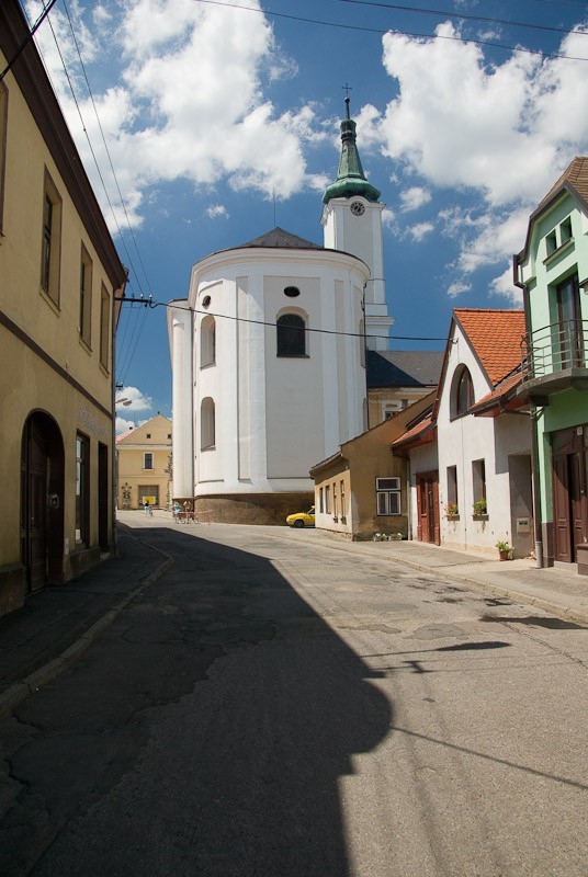 Byl postaven v letech 1762-66 podle plánů Pavla Merty z Boskovic v pozdně barokním slohu na místě staršího strženého kostela. V severní části byla později přistavěna Karlem Vincencem z Neuburku roku 1778 kaple s hrobkou a svému účelu sloužila až do roku 1869, kdy byl kostel vážně poškozen požárem. Po rekonstrukci v pozdějších letech dostal dnešní podobu. V interiéru bohaté barokní a rokokové vybavení a vzácná dřevěná gotická soška Panny Marie. V sousedství čtyřkřídlá budova bývalého augustiánského kláštera z konce 14. století, později barokně upravená s ozdobným portálem a renesančním znakem Markrabství moravského z roku 1593 umístěného nad ním. Nyní školské zařízení.