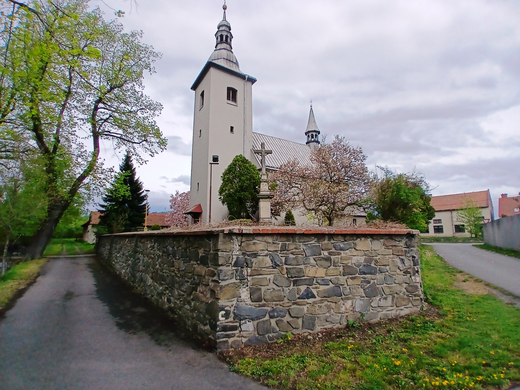 Jezernice - Kostol sv. Martina, dve magnólie a most cez Jezernický potok