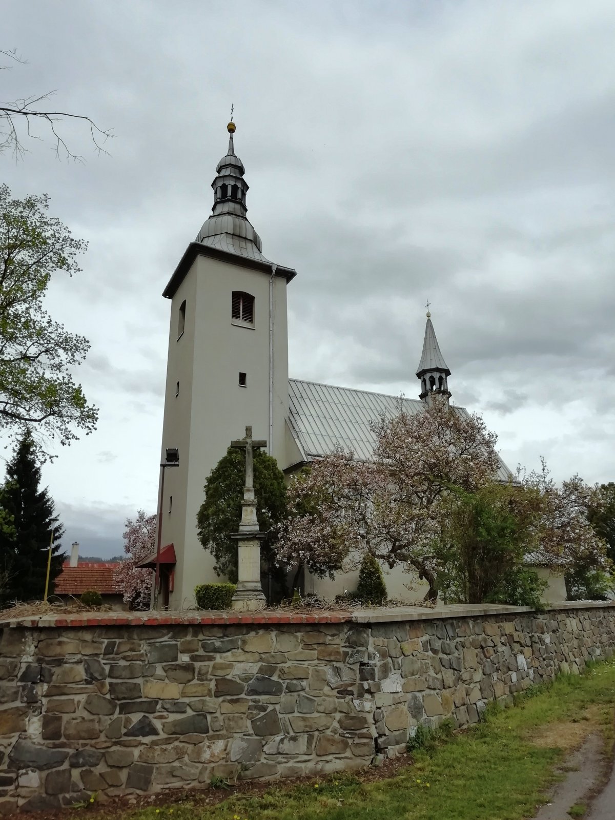 Jezernice - Kostol sv. Martina, dve magnólie a most cez Jezernický potok