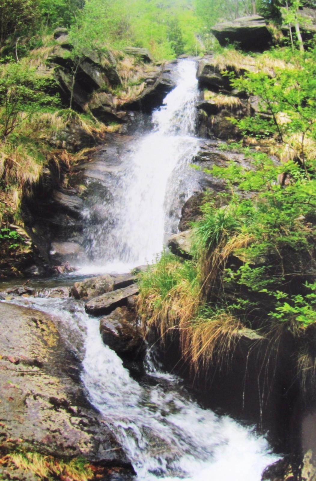 My ale pokračujeme dále proti proudu Borového potoka, stoupání je už strmější a také potok tu má větší spád. Jeho koryto vyplňují kameny a balvany, které voda překonává skoky v četných kaskádách a menšími vodopádky. To už ale vcházíme do řídkého lesíka a vpravo ve svahu vidíme dlouhé pásy Vysokých skal,které sem spadají ze svahů Medvědí hory. Najednou slyšíme rachotivé burácení vody a to už stojíme pod překrásným stupňovitým vodopádem, jehož nejvyšší "schod" má výšku 8 m. Krása tohoto přírodního fenoménu a i celého okolí je napopsatelná - vřele všem zájemcům doporučuji vidět toto místo na vlastní oči a hukot padající vody slyšet na vlastní sluchová ústrojí!! Při troše opatrnosti se dá stezičkou vystoupat vpravo nad vodopád pod skalní útesy a nakouknout do divoké neprostupné rokle potoka nad vodopádem. Vrchol horní nádrže Dlouhé Stráně je odtud vzdušnou čarou vzdálen jen asi 1.5 km.