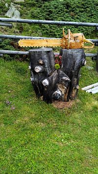 Také tu můžete obdivovat řezbářskou práci majitele chatky.