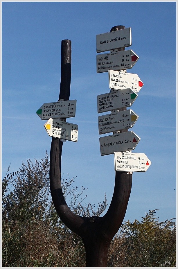 Přístup: Do obce Slavný možno autobusem z Police nad Metují nebo autem. Nad obcí je parkoviště a 200 metrů od něho rozcestí (foto 1). Od něho vede vyhlídková značka k těm "nejprofláknutějším" (foto 3), ale cestou potkáte i další (foto 2). Asi po 300 metrech můžete odbočit vpravo alespoň juknout shora do Zaječí rokle (foto 4 - 6). A z konce značené stezky se pak můžete pokochat i pohledem na skálu zvanou Čertova tchýně (foto 7). Popsaná trasa - https://www.turistika.cz/trasy/broumovske-steny-ze-slavneho-na-hvezdu-a-zpet