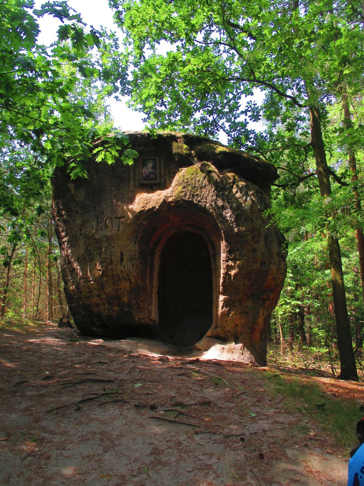 Mezi Želízy a Liběchovem zachází ze silnice do lesa modrá turistická značka, po níž brzy přicházíme k jeskyni Klácelka, dalšímu sochařskému dílu Václava Levého.