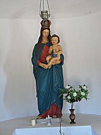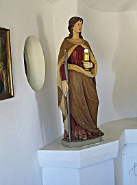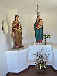 Vchod do kaple má nahoře půlkruhové zakončení a namísto dveří je opatřen zajímavou kovářskou prací s křížem a mřížováním, přes nějž jde do interiéru bez problémů nakouknout. Uvnitř visí na stěnách obrazy a jsou zde umístěny dvě polychromované sochy. Ta vedlejší zobrazuje svatou patronku s dlouhými vlasy, která si u boku jednou rukou přidržuje meč a ve druhé svírá zlatý kalich. Podle těchto atributů bych soudil, že se jedná o svatou Barboru. Hlavní skulpturou je Panna Marie s Ježíškem sedícím jí na ruce.