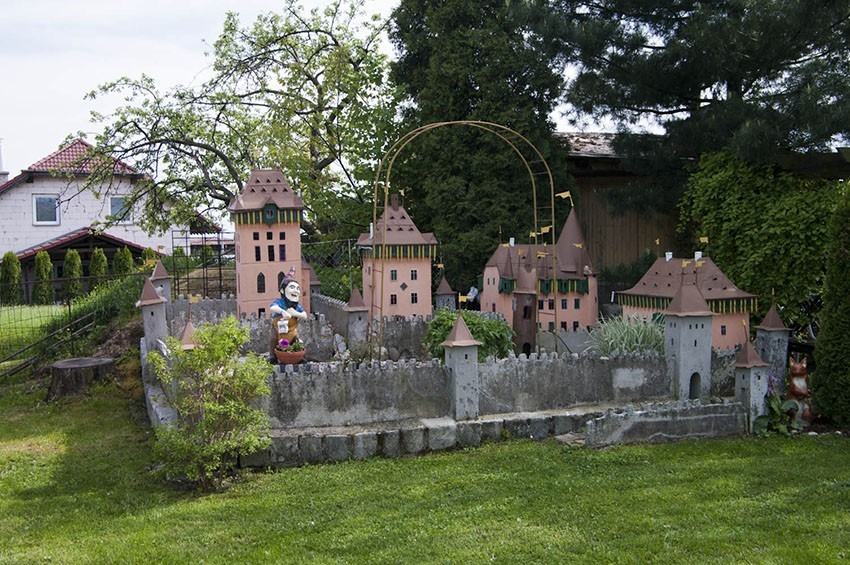 Že jsme národ kutilů, řemeslníků, vynálezců či hračičků není třeba zvlášť vyzdvihovat. Tvůrčí činnost některých jednotlivců leckdy překvapí zřejmě i samotné vynálezce. Někdo si vyzdobí jen svůj příbytek, jiný musí svou tvůrčí činnost dát na odiv i okolnímu světu a vyzdobit i exteriér svého okolí. Kdo si svou zahrádku ozdobí nějakým trpaslíkem či podobnou plastikou je už celkem pro okolí nezajímavý. Občas si někdo ovšem postaví něco, co se přece jen poněkud vymyká běžným měřítkům. Jeden takový objekt jsem nedávno objevil v osadě Nový Svět u Slatiny. V tomto případě jde o obec v Oderských vrších nedaleko Bílovce. Zahradu vedle hospody v zmíněné části obce zdobí celkem ojedinělý model jednoho z našich nejznámějších hradů. Najdeme model který celkem věrně interpretuje podobu královského hradu Karlštejna. Stavba převážně z betonu, sádry a cihel je skutečně značně hradu podobná, ovšem zřejmě nebude zcela přesná. Minimálně dolní část hradu se mi zvlášť nepozdávala. Ovšem jinak je stavba dosti impozantní, odhadoval bych tak měřítko něco mezi 1:10–15. Výška velké věže je něco přes 1m, šířka celé stavby je cca 4m. Ostatně jako měřítko poslouží běžný trpaslík či figurka lišky, které vkusně doplňují toto mimořádné dílo.