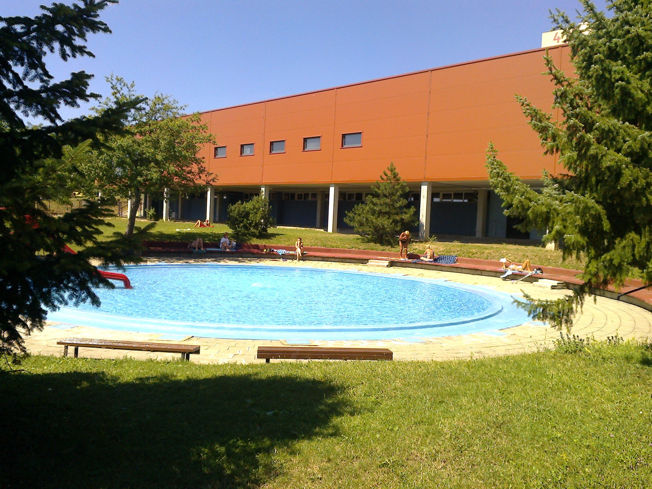 Mají tady sice starší, ale architektonicky zajímavý a pěkně udržovaný krytý bazén 25 m s hloubkou 1,40 a 3,40 m. A tentzo bazén v horkých letních dnech propojují s malým bazénkem venku v zahradě. Místa je kolem bazénku spousta, tráva krásně střižená a lidí ne zas tolik. Vstup je buďto přímo přes krytý bazén z Halasova náměstí nebo z ulice Okružní.