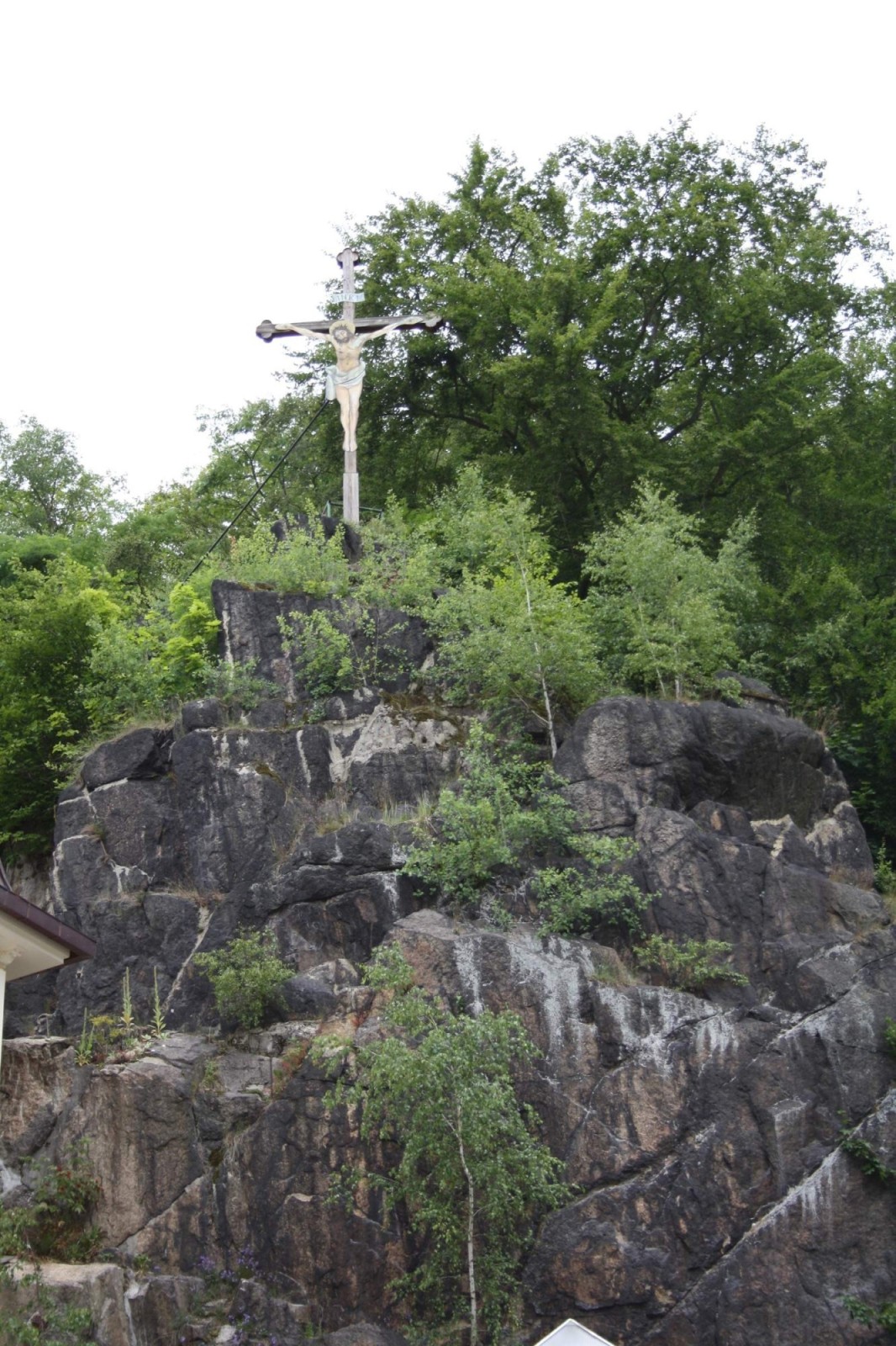 Na výrazné žulové skále nad řekou Teplou nedaleko dolní stanice lanové dráhy na Dianu se nachází velký dřevěný kříž. Na jeho straně obrácené k řece je připevněn na plechu malovaný Ukřižovaný Ježíš Kristus a tabulka s nápisem „INRI“ (Iesus Nazarenus Rex Iudaeorum, česky Ježíš Nazaretský, král židovský).