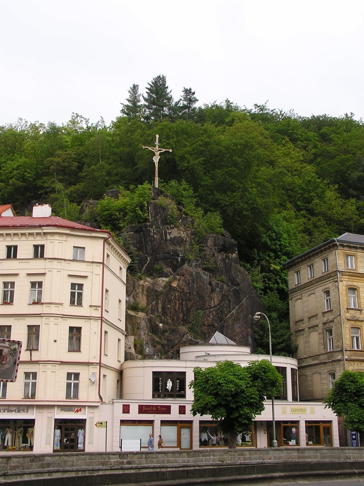 Na výrazné žulové skále nad řekou Teplou nedaleko dolní stanice lanové dráhy na Dianu se nachází velký dřevěný kříž. Na jeho straně obrácené k řece je připevněn na plechu malovaný Ukřižovaný Ježíš Kristus a tabulka s nápisem „INRI“ (Iesus Nazarenus Rex Iudaeorum, česky Ježíš Nazaretský, král židovský).